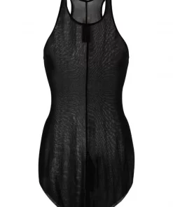 Effet de transparence, dos-nu, dos nageur, ourlet incurvé. Couleur : noir.