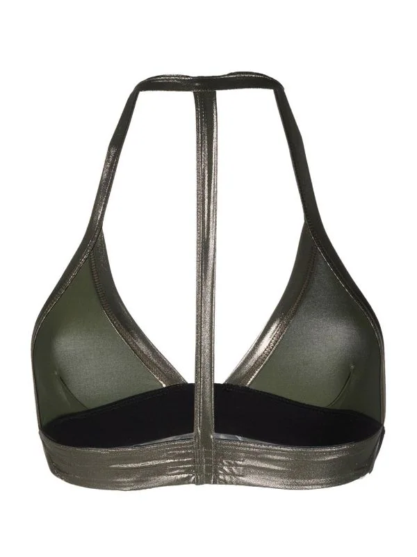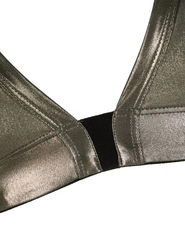 Design en maille, bonnets triangles, dos-nu, bride salomé, fini métallisé, construction stretch. Couleur : or.