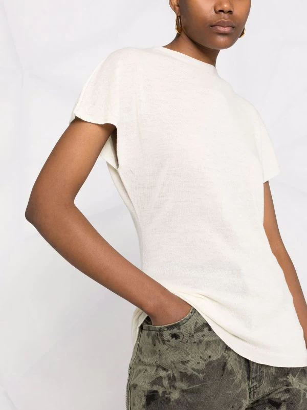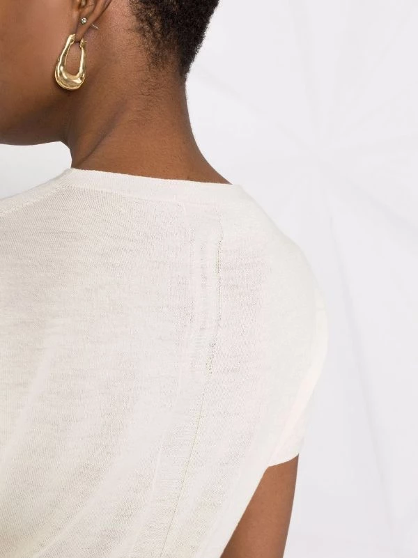 Design ton sur ton, design en maille, encolure ronde, manches courtes. Couleur : tons neutres. Matière : laine vierge.