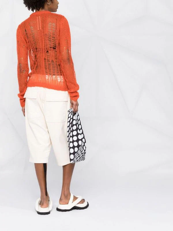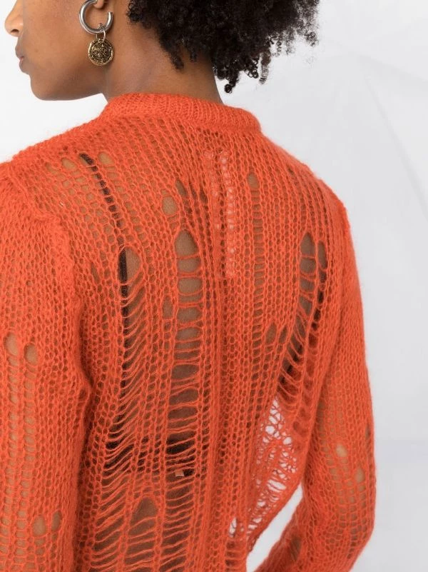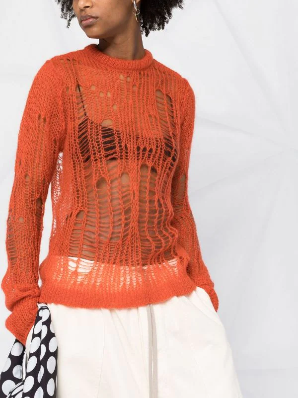 Maille ajourée, encolure ras du cou, manches longues, ourlet nervuré. Couleur : orange.