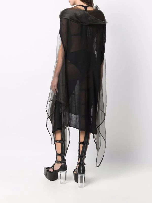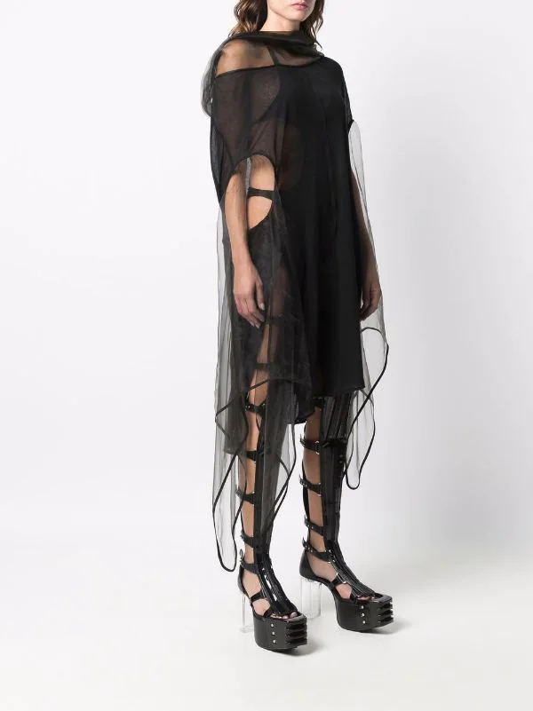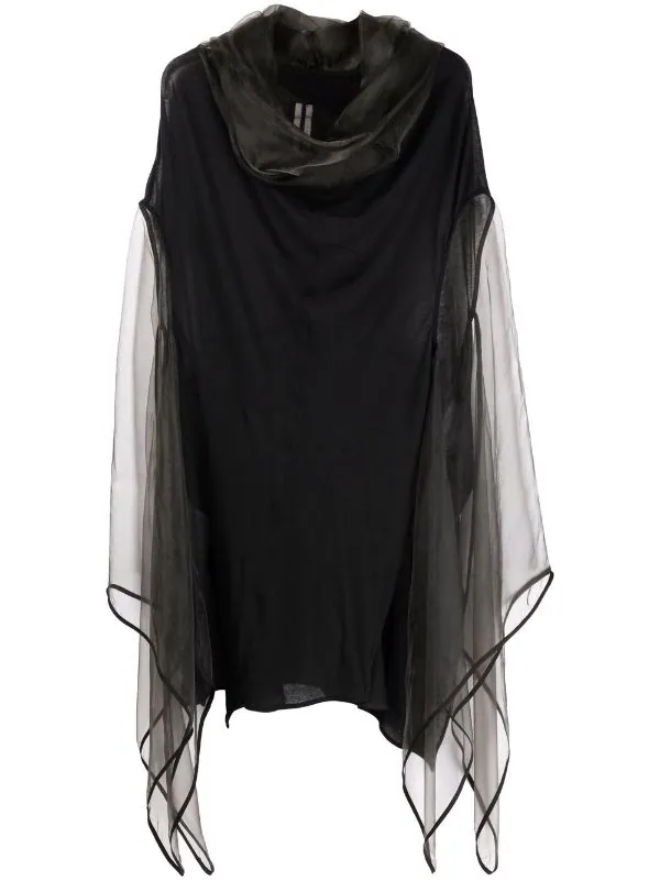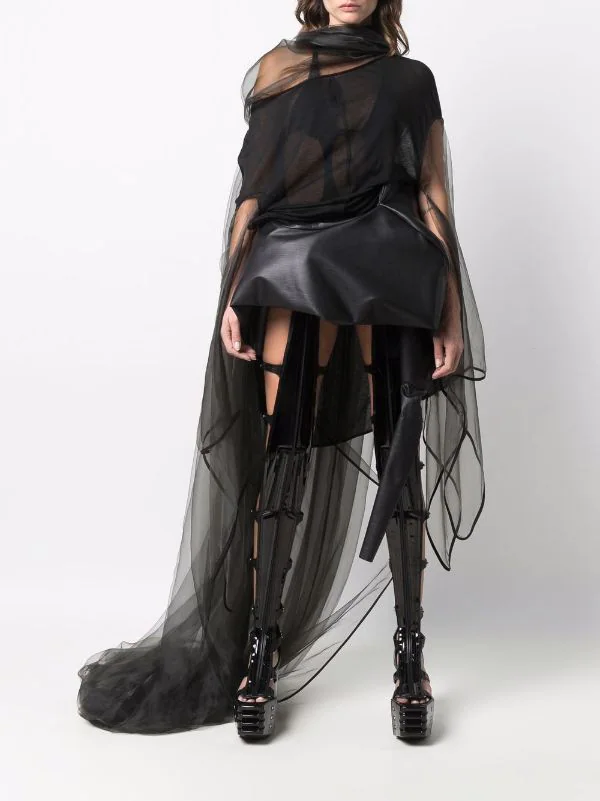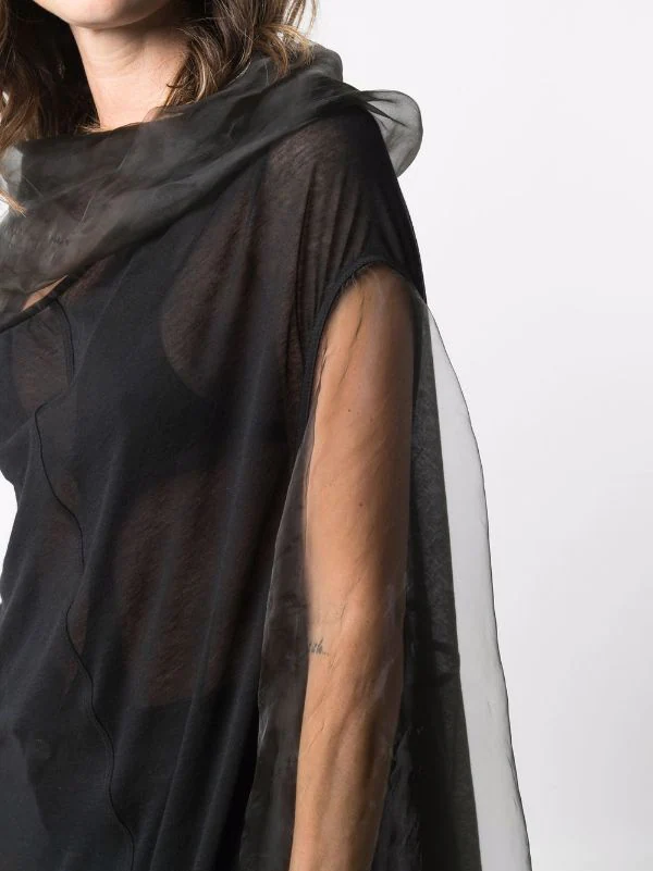 Encolure ronde, ourlet asymétrique, manches courtes, superposition en tulle. Couleur : noir. Matière : coton mélangé.