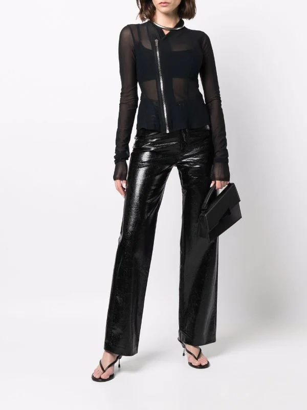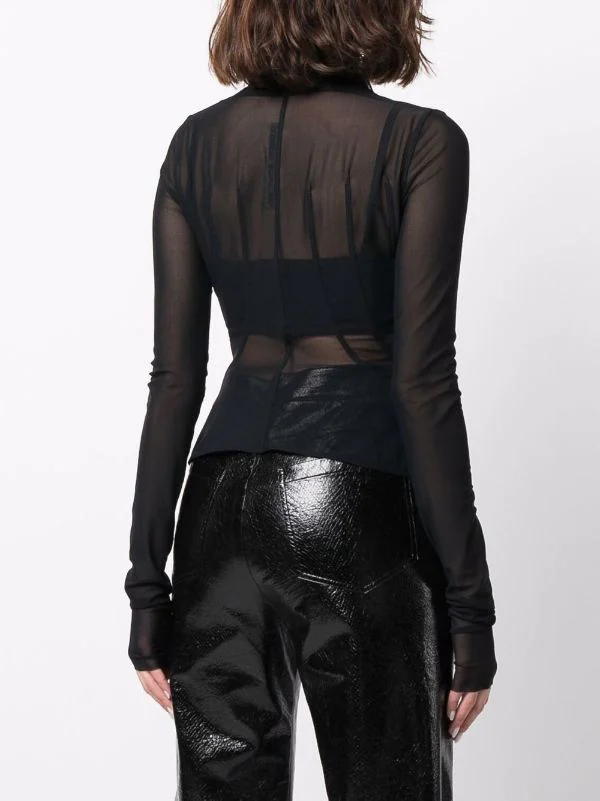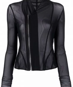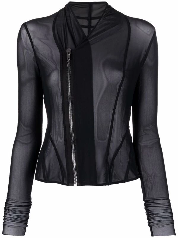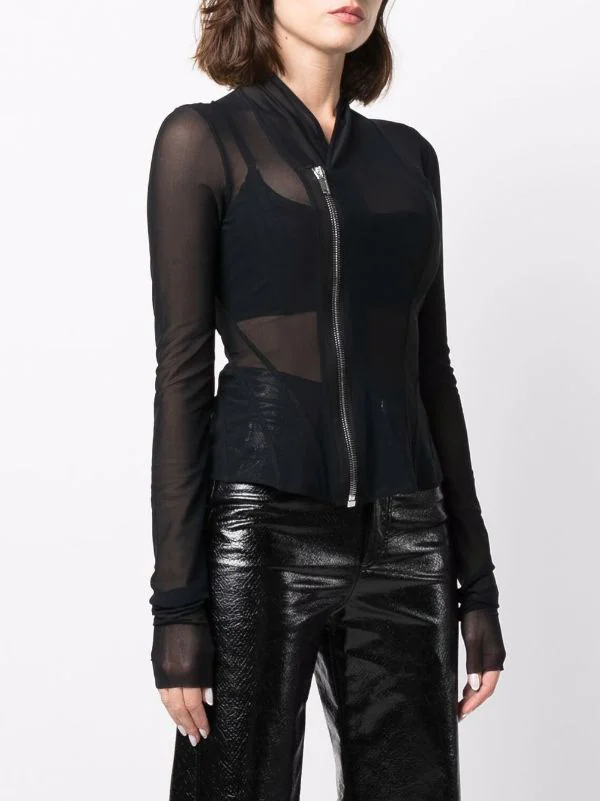 Couvrance transparente, détails de coutures apparentes, fermeture zippée en biais, col v, manches longues, ourlet droit. Couleur : noir.