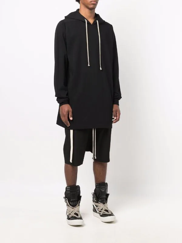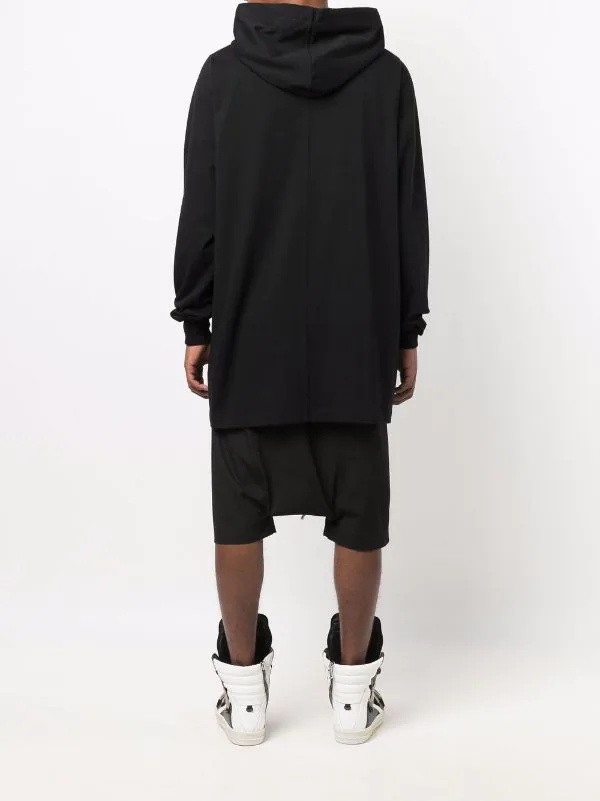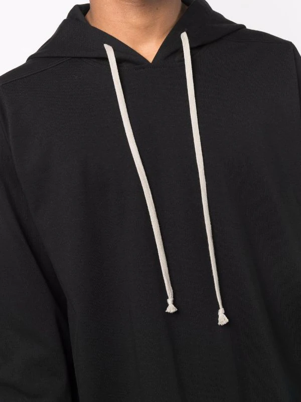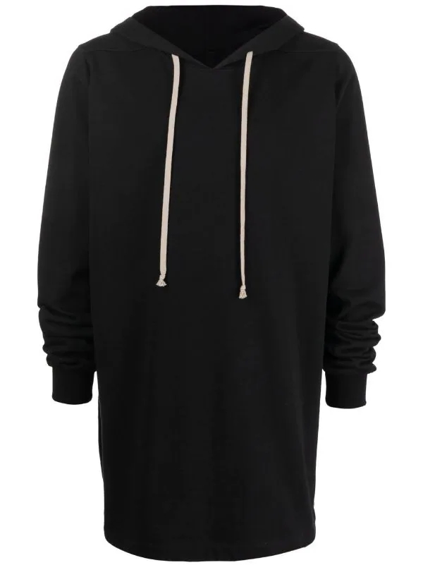 Capuche à lien de resserrage, manches longues, longueur maxi, manches longues. Couleur : noir. Matière : coton.