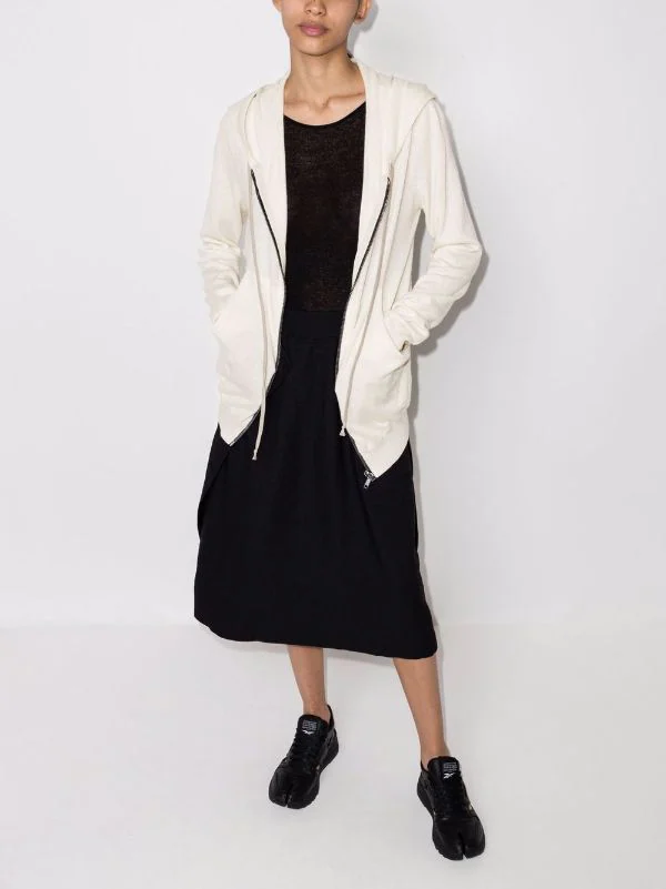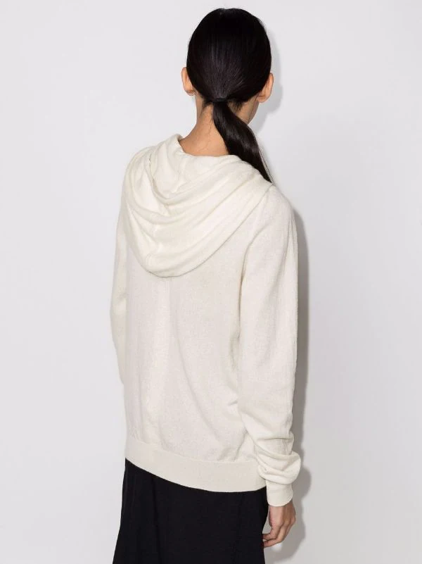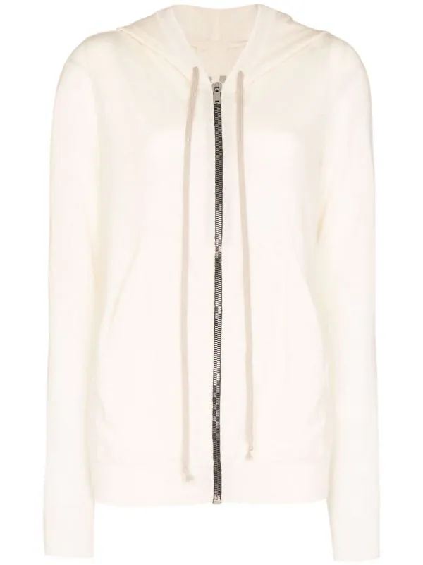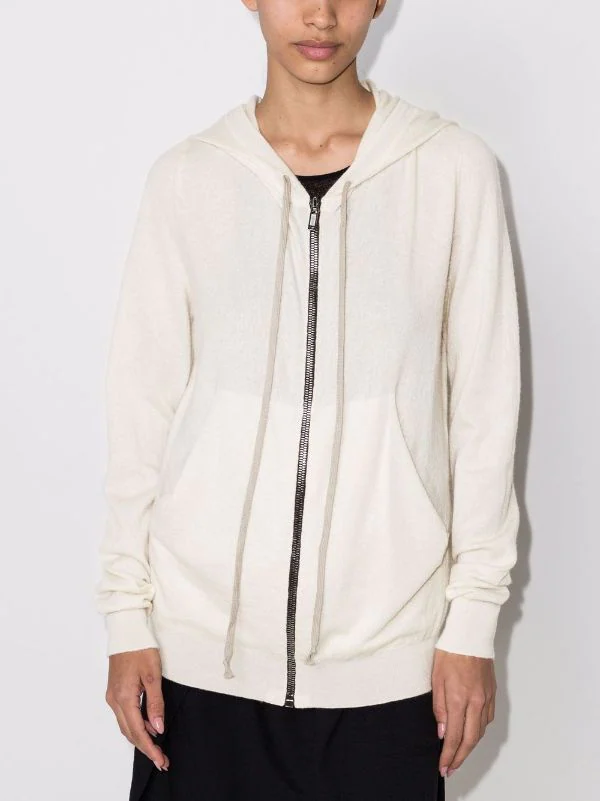 Capuche à lien de resserrage, fermeture zippée devant, manches longues, deux poches à rabat, ourlet droit, bordures nervurées. Matière : cachemire.