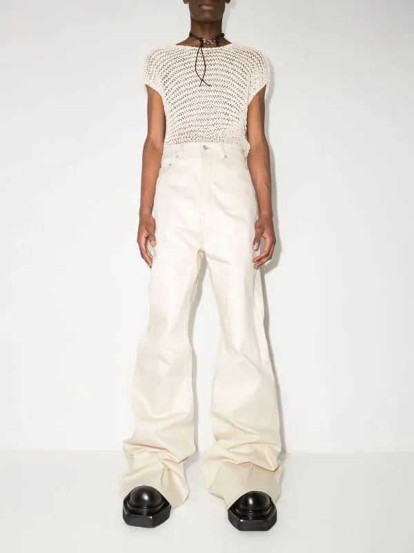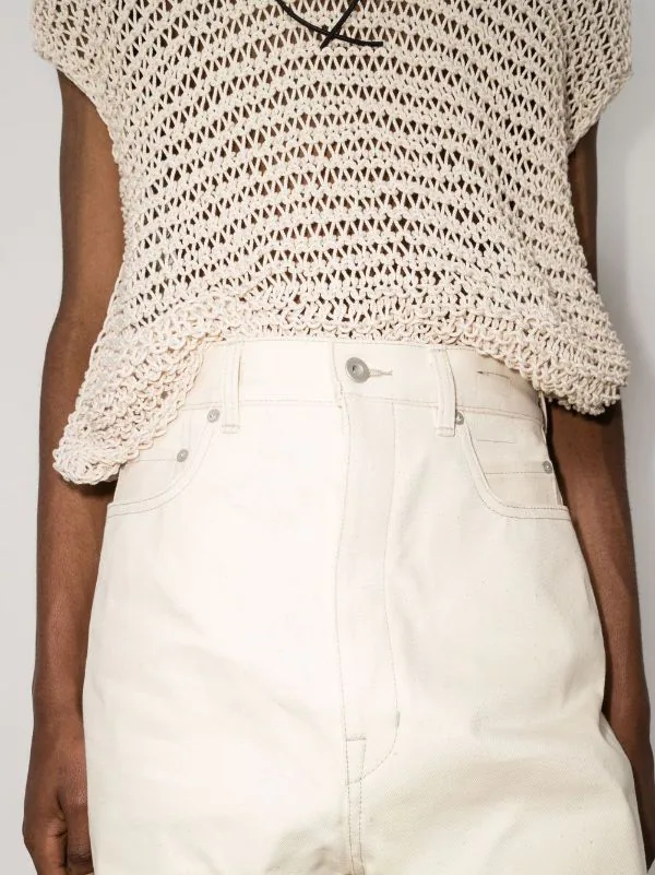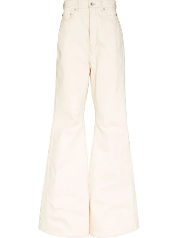 Crème, coton, taille mi-haute, fermeture boutonnée, passants de ceinture, cinq poches classiques, entrejambe sarouel, coupe évasée, longueur maxi.