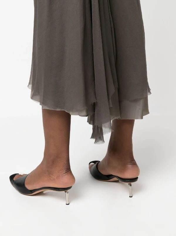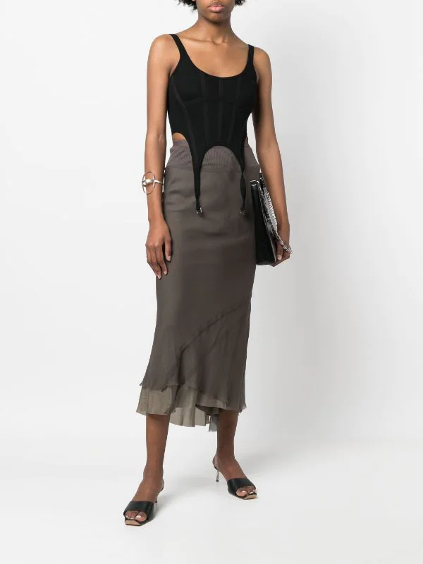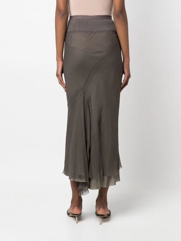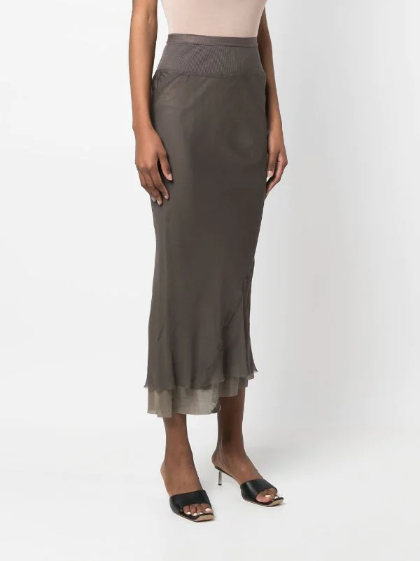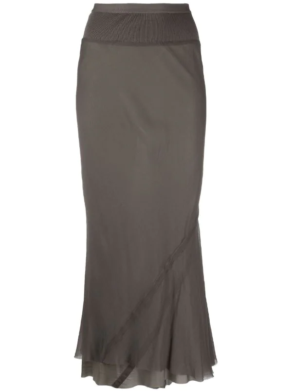 Marron, soie, coton mélangé, détail nervuré, taille haute, ourlet élastiqué, design asymétrique.