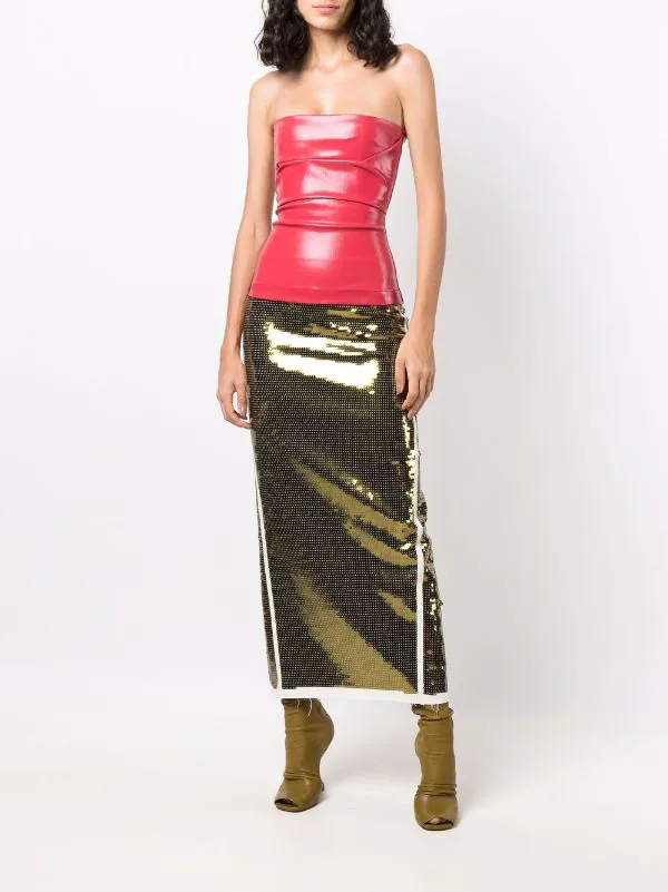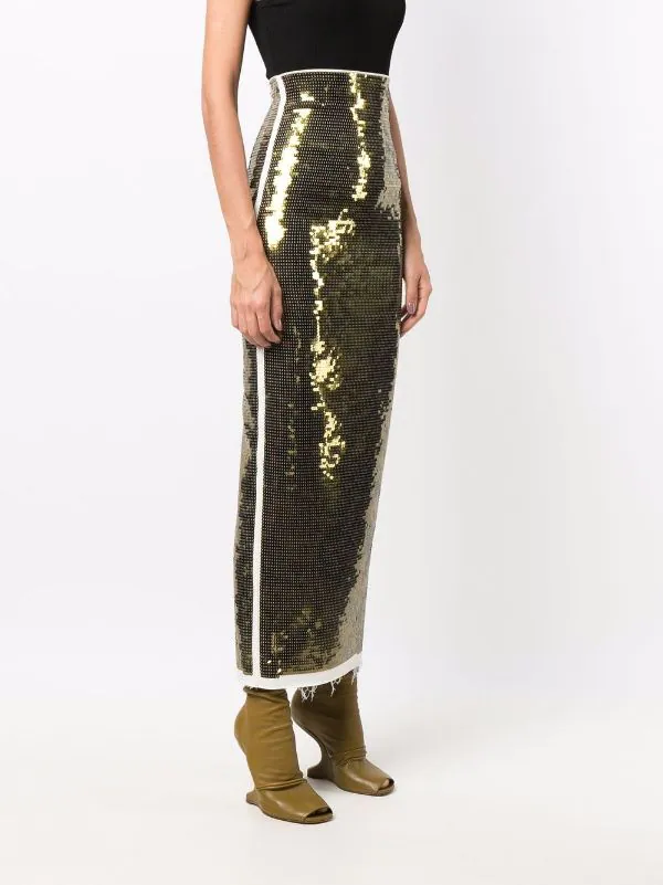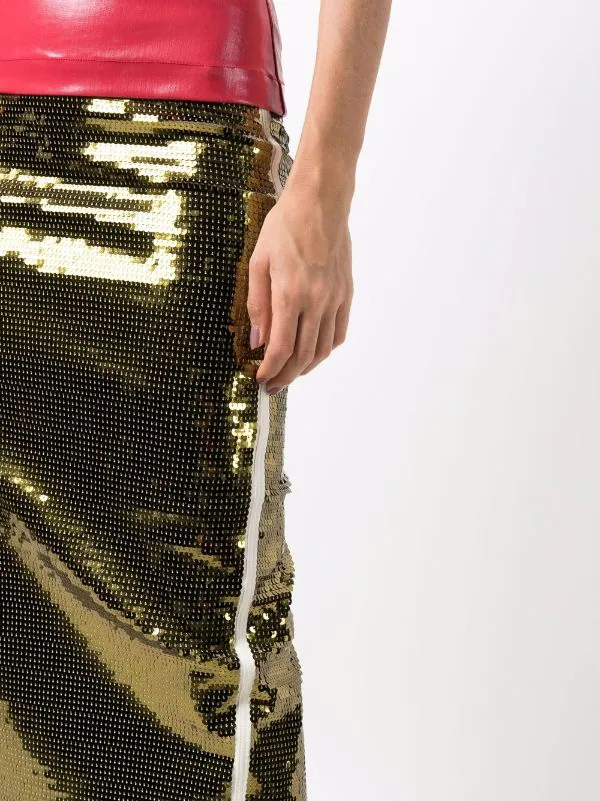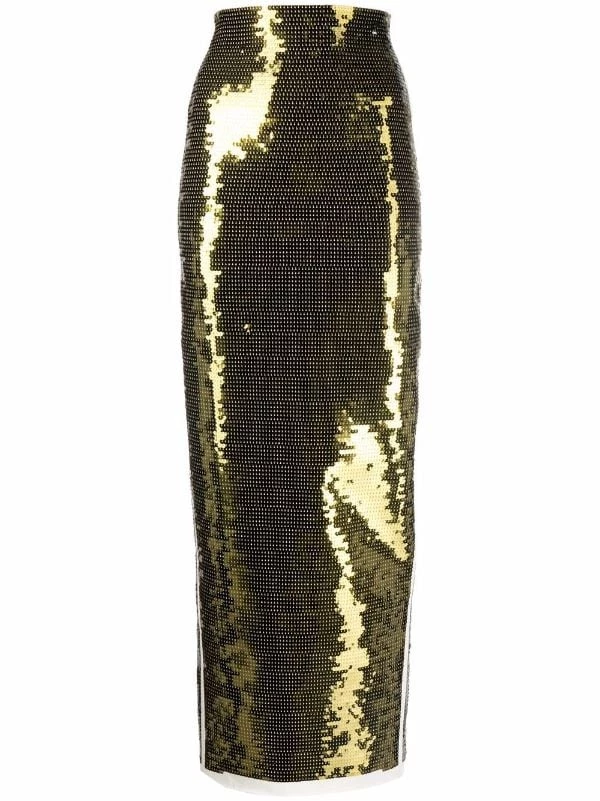 Détails de sequins, coupe longue, bordure contrastante, jupe crayon. Couleur : or.