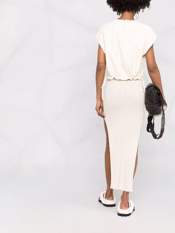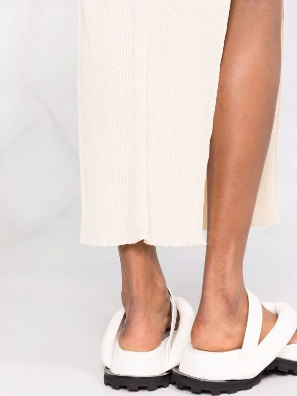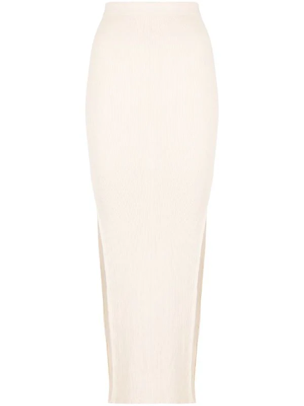 Design ton sur ton, taille haute, détail de fente. Couleur : tons neutres. Matière : coton.
