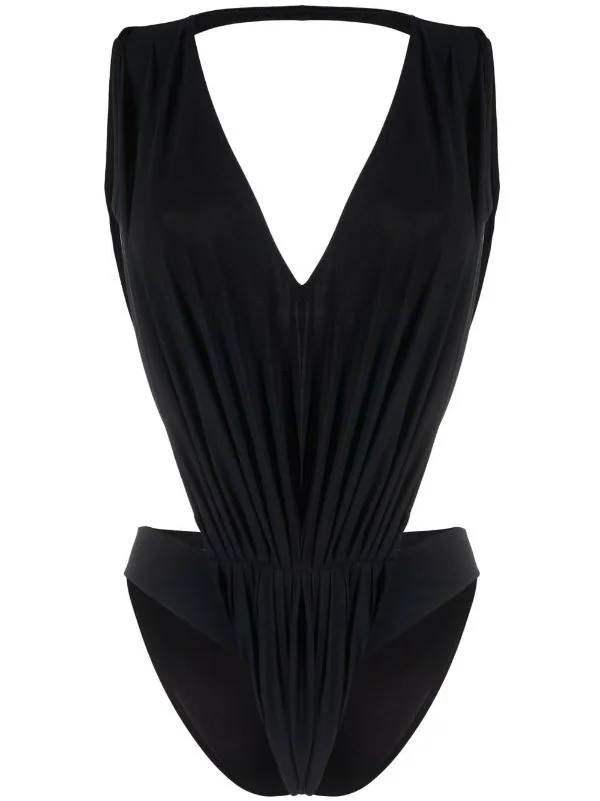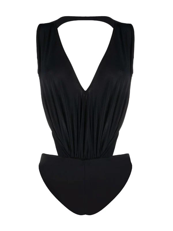 Détails de fronces, détails de découpes, col v profond, design sans manches, coupe échancrée. Couleur : noir. Veillez à essayer les maillot de bain par-dessus vos propres sous-vêtements.