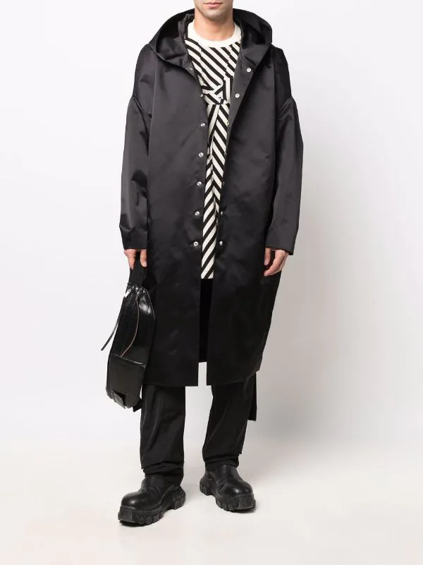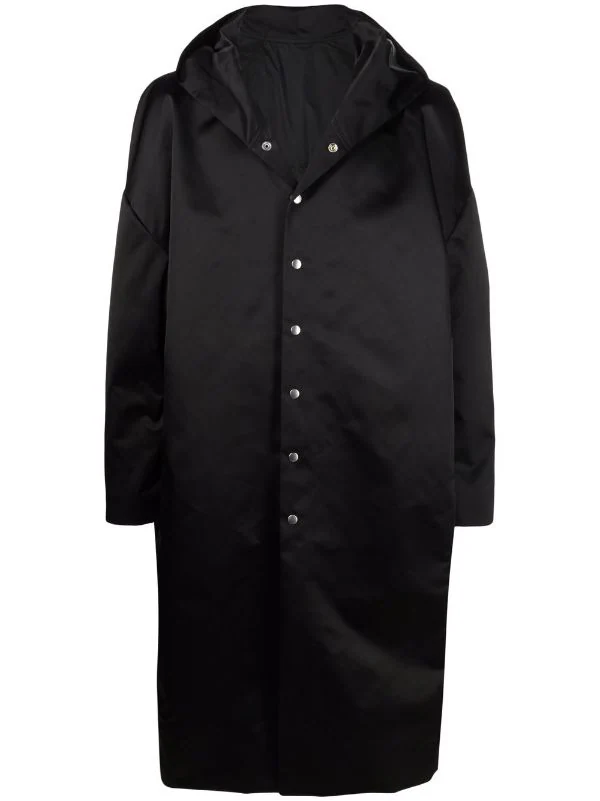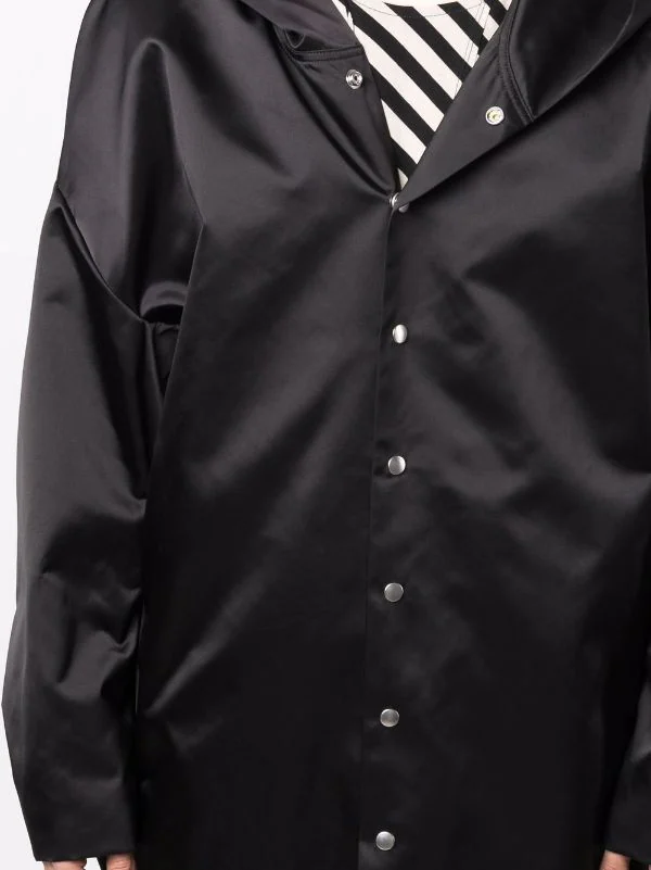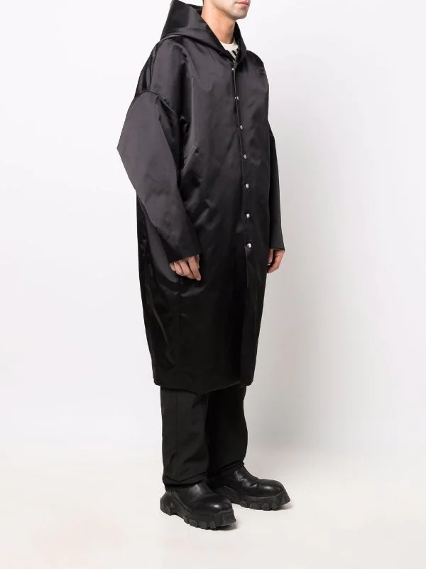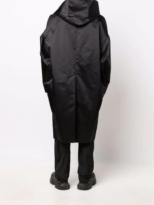 Capuche classique, fermeture à boutons pression, épaules tombantes, manches longues. Couleur : noir.