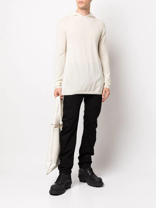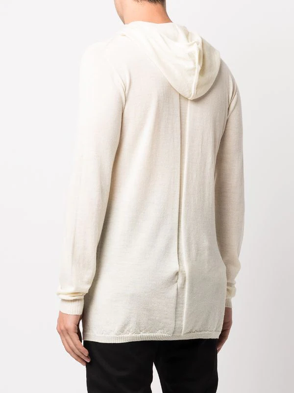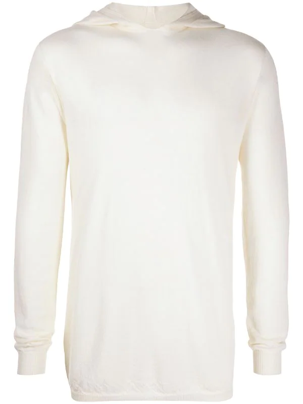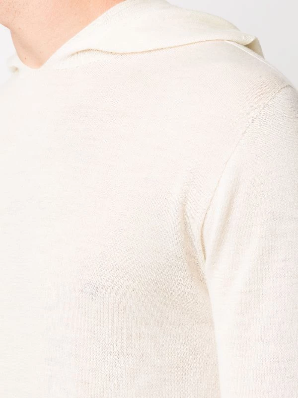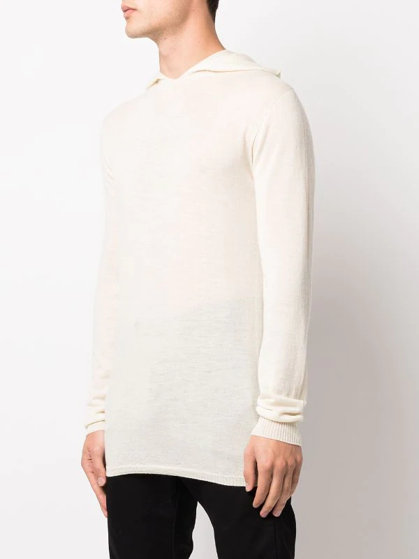 Maille fine, manches longues, capuche classique, ourlet droit. Matière : laine.
