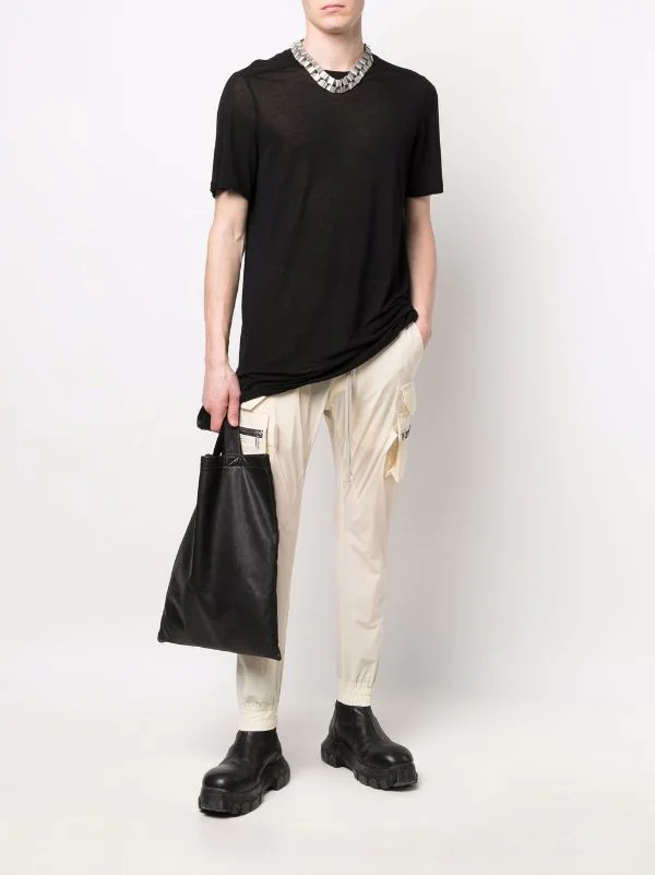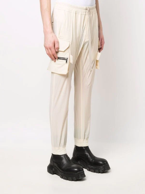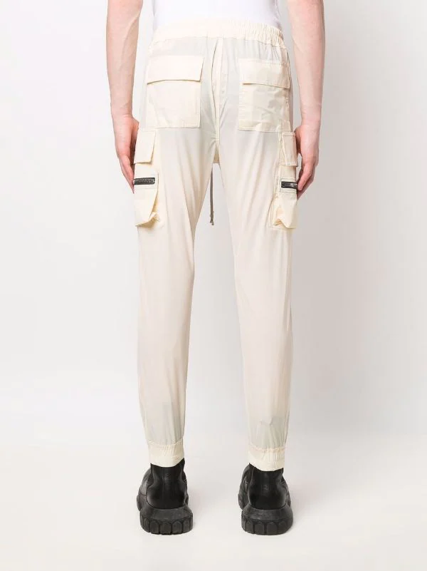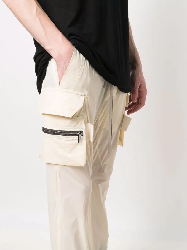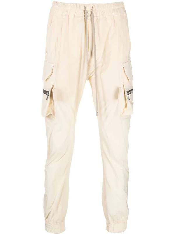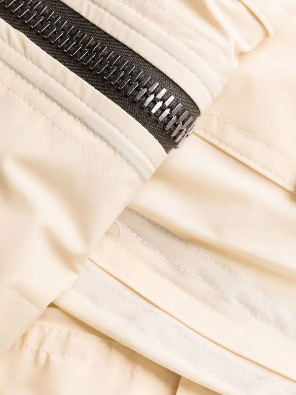 Lien de resserrage à la taille, poches latérales à rabat, détails zippés, poches arrière à rabat. Couleur : tons neutres.