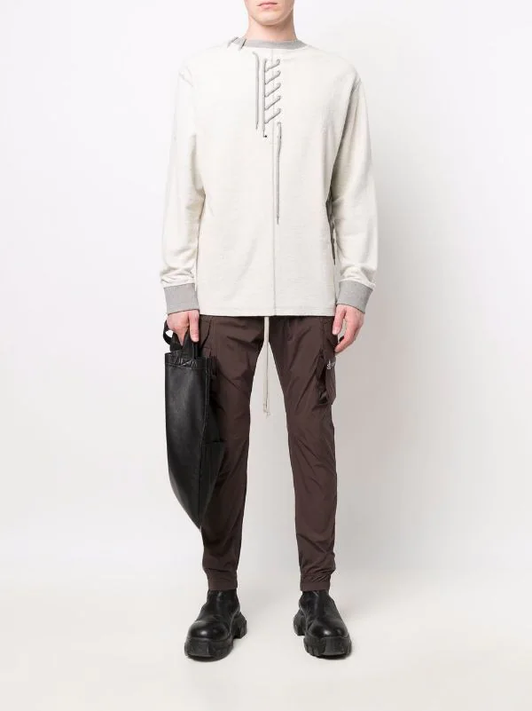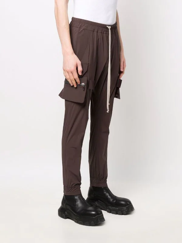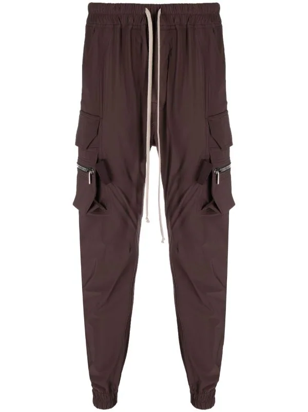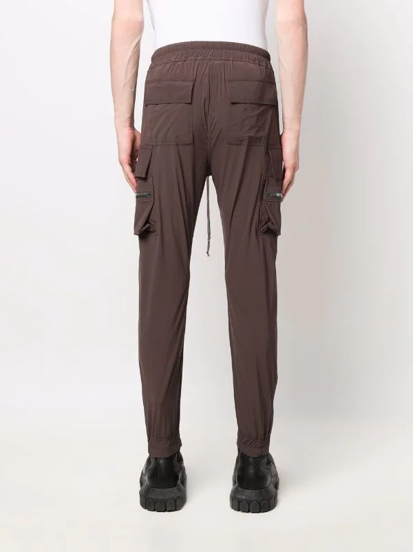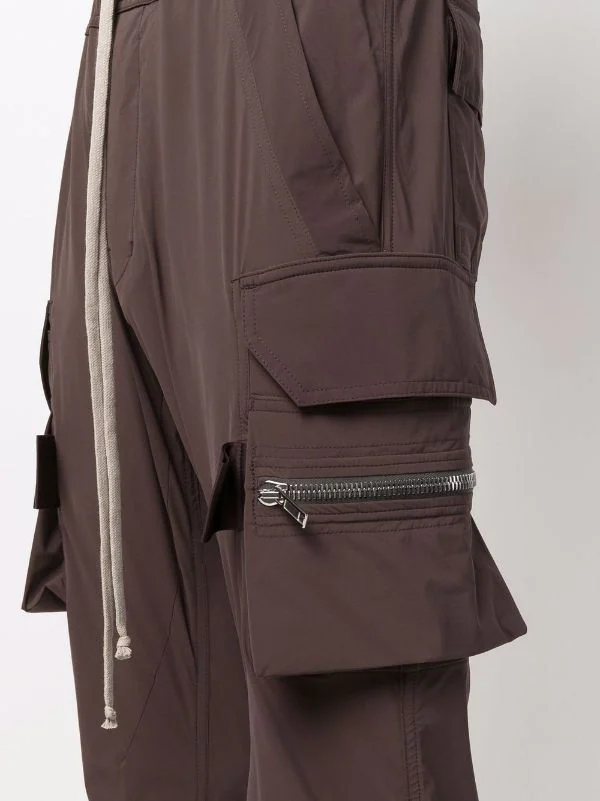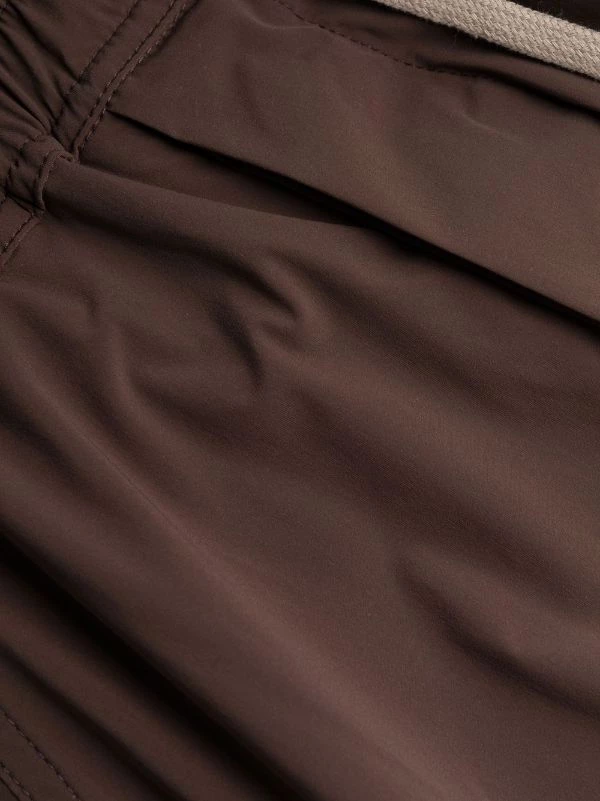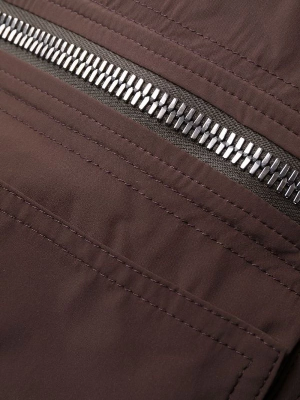 Lien de resserrage à la taille, deux poches latérales à rabat, détails zippés, poches arrière à rabat. Couleur : marron.