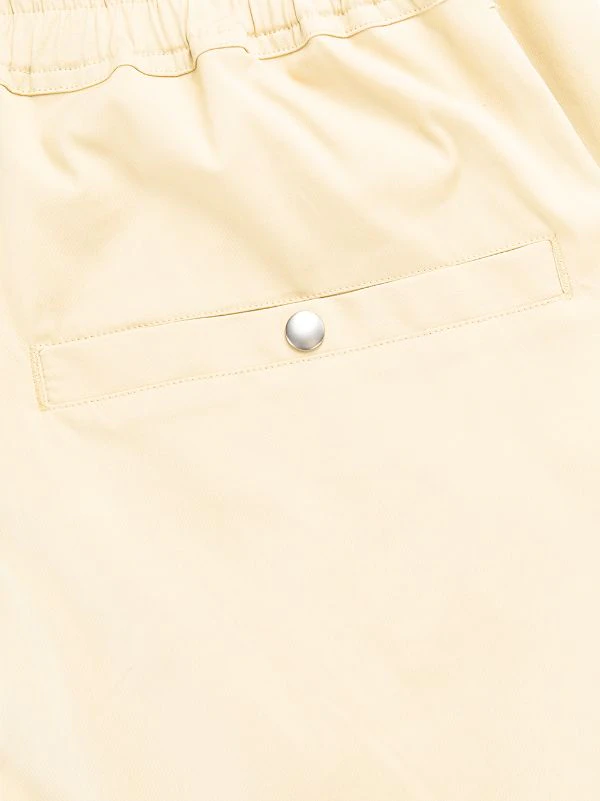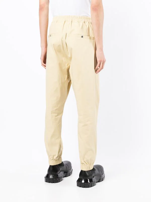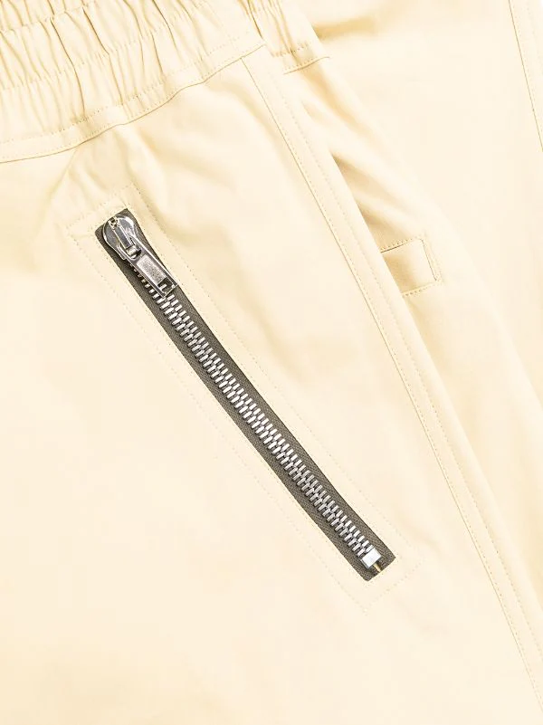 Chevilles zippées, chevilles élastiques, taille élastique à lien de resserrage, poches à fermeture zippée devant, poches arrière passepoilées.