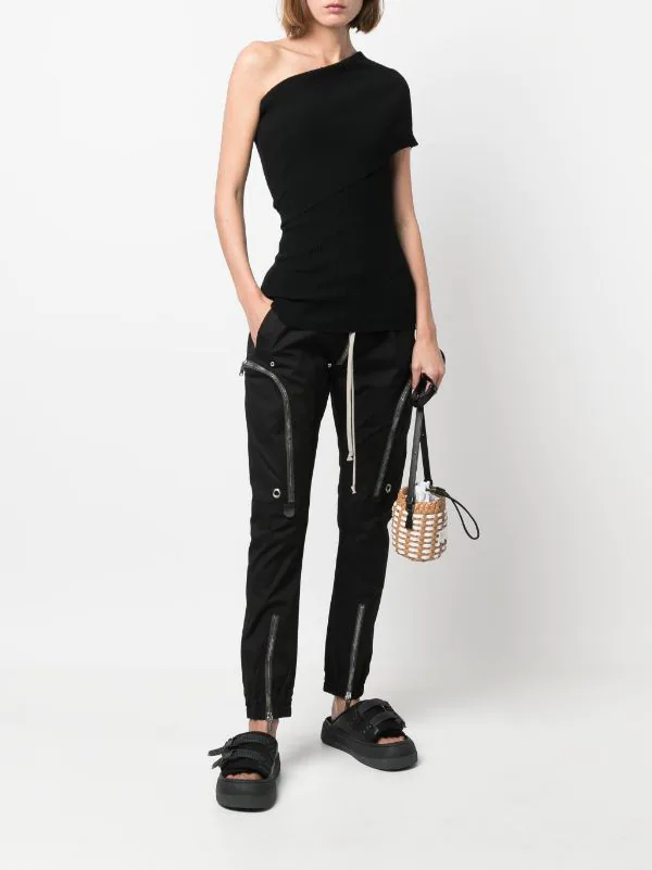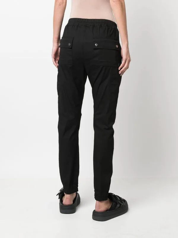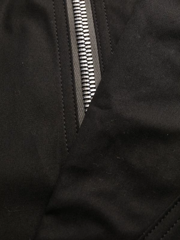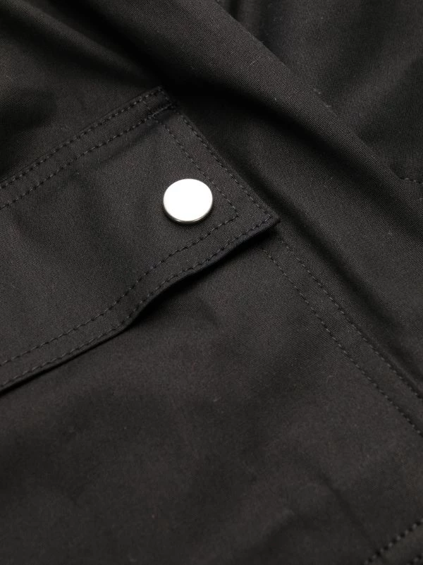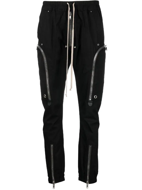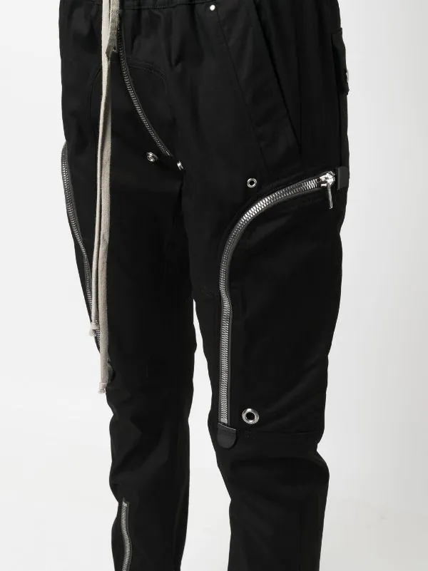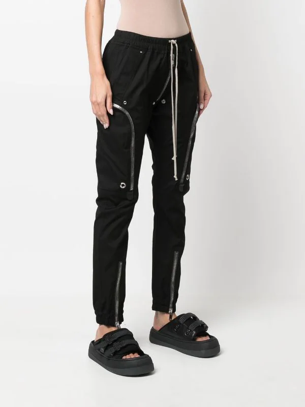 Taille élastique à lien de resserrage, fermeture zippée devant, chevilles zippées, deux poches latérales zippées, poches arrière à rabat, poches latérales fendues. Couleur : noir.