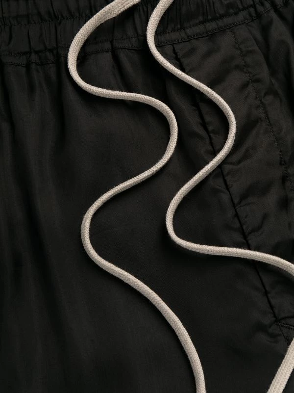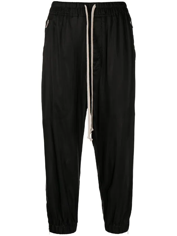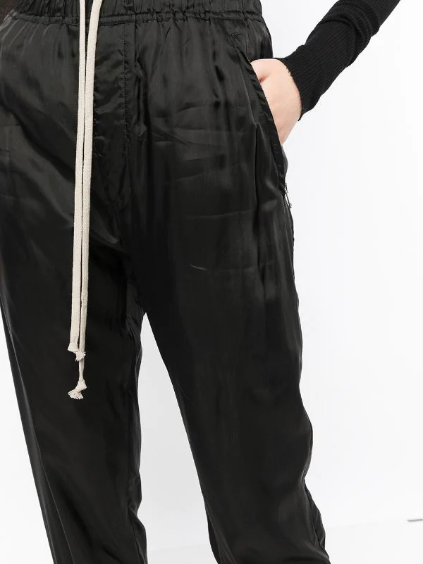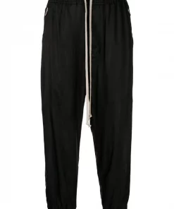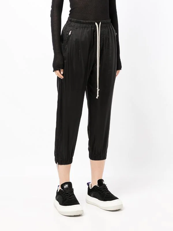 Taille haute, coupe fuselée, longueur crop, taille élastique à lien de resserrage, poches plaquées latérales. Couleur : noir.