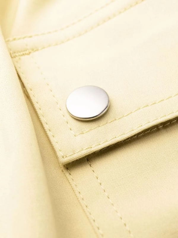Fermeture zippée devant, détail de zip, coupe courte, taille à lien de resserrage, poches arrière à rabat. Couleur : jaune. Matière : coton mélangé.