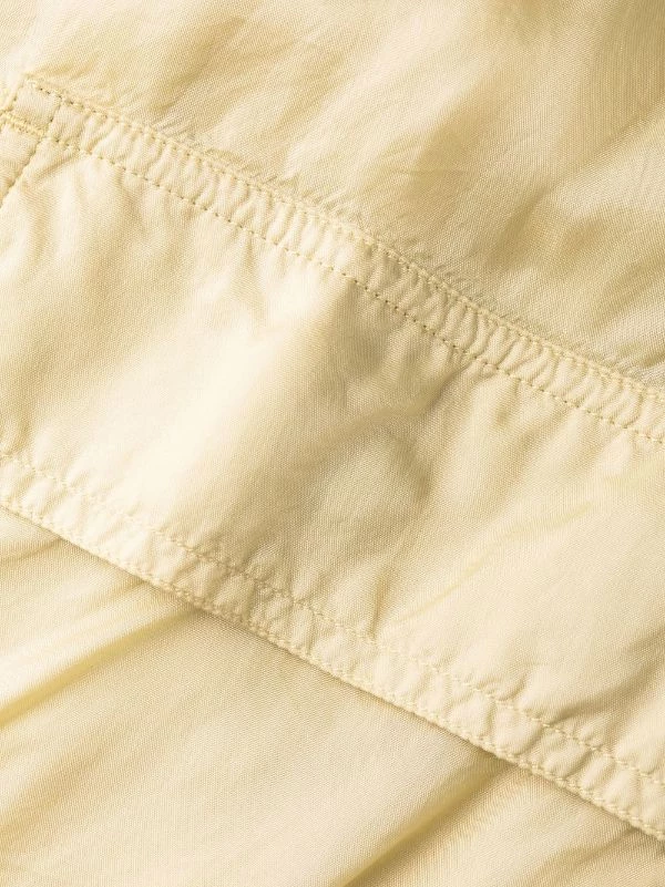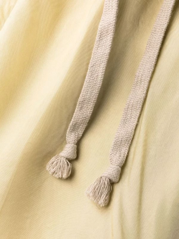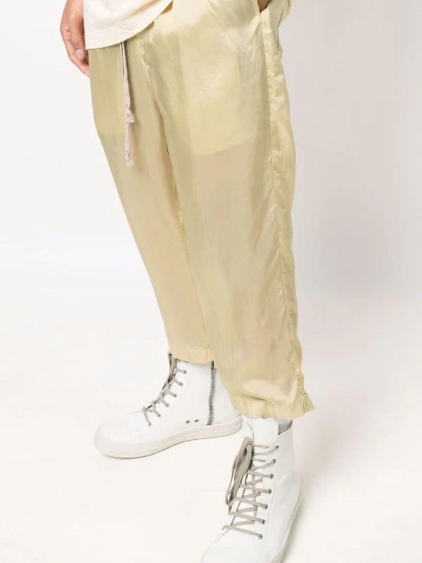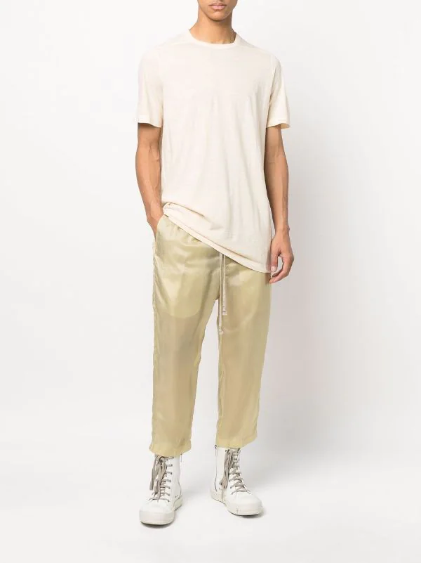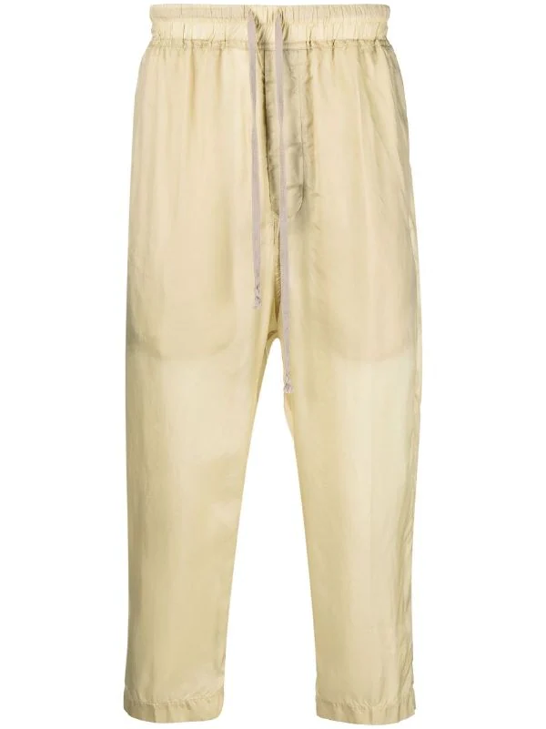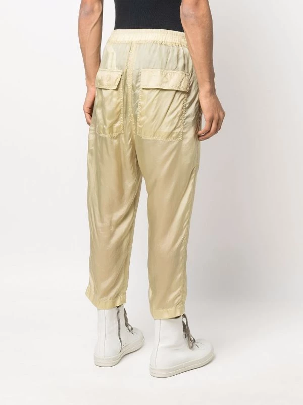 Lien de resserrage à la taille, deux poches latérales plaquées, poches arrière à rabat, coupe slim, longueur crop, coupe droite.