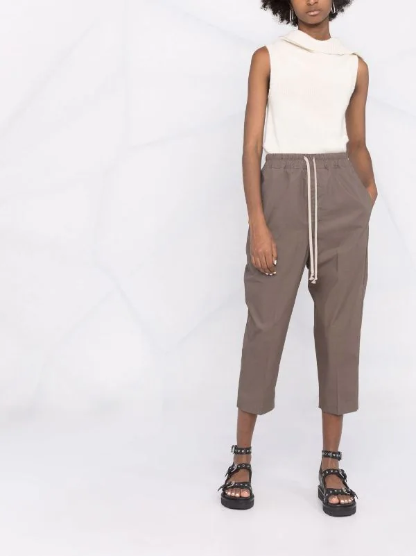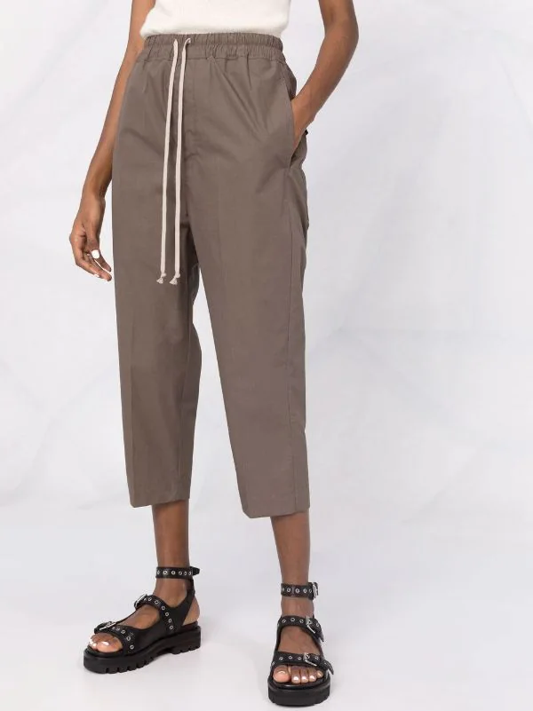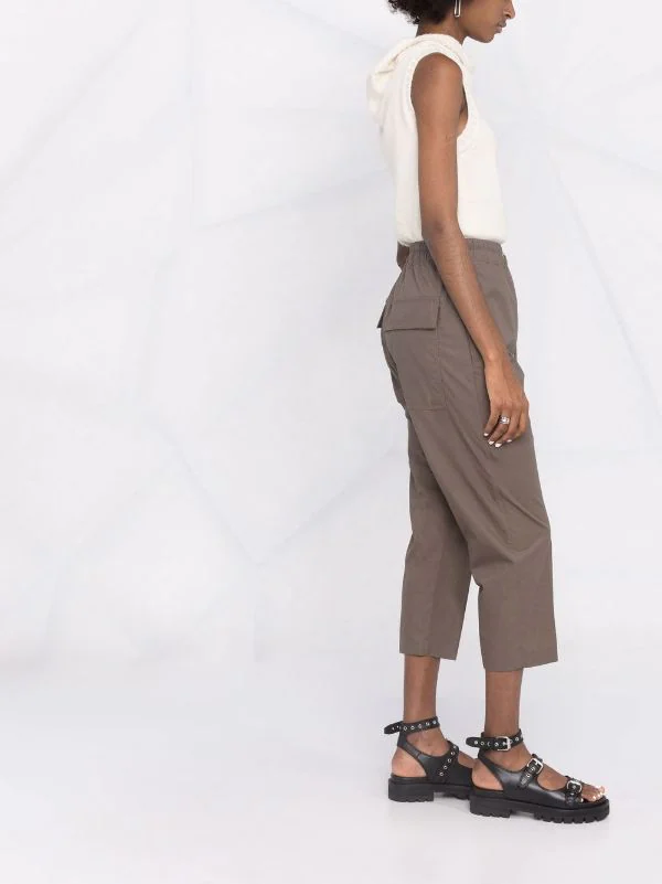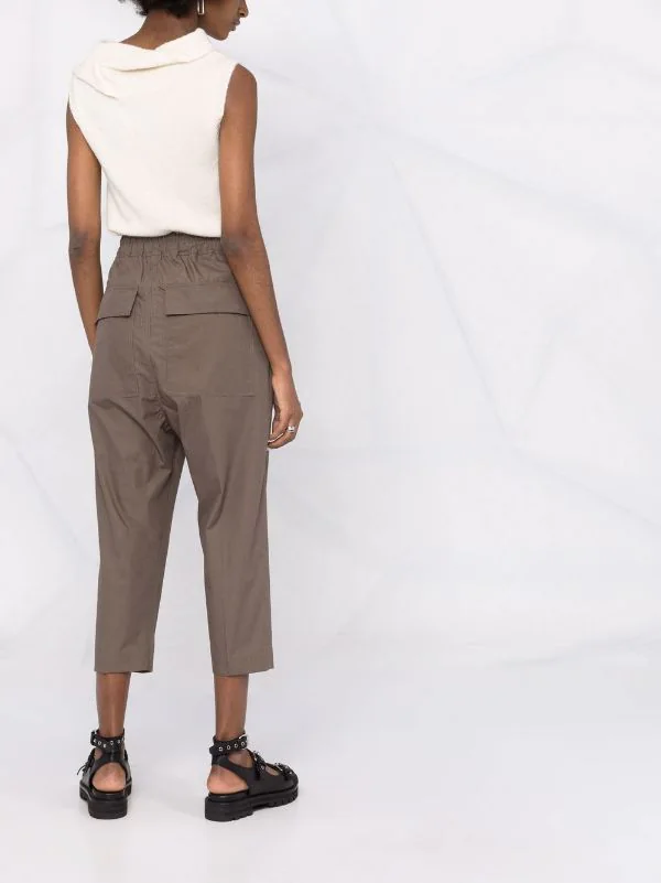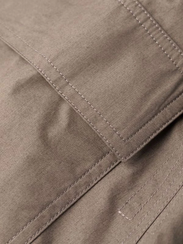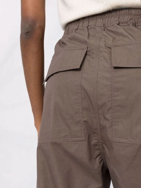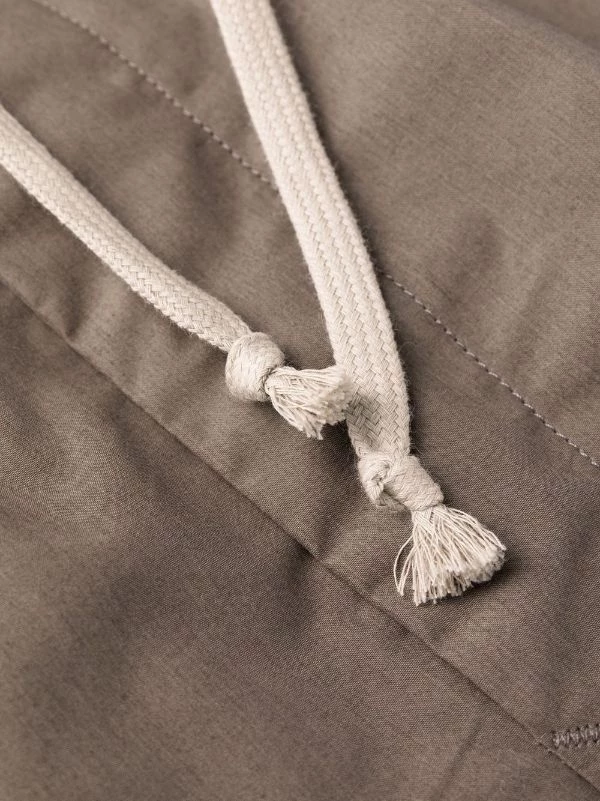 Taille élastique à lien de resserrage, deux poches latérales fendues, poches arrière à rabat, coupe courte. Matière : coton.