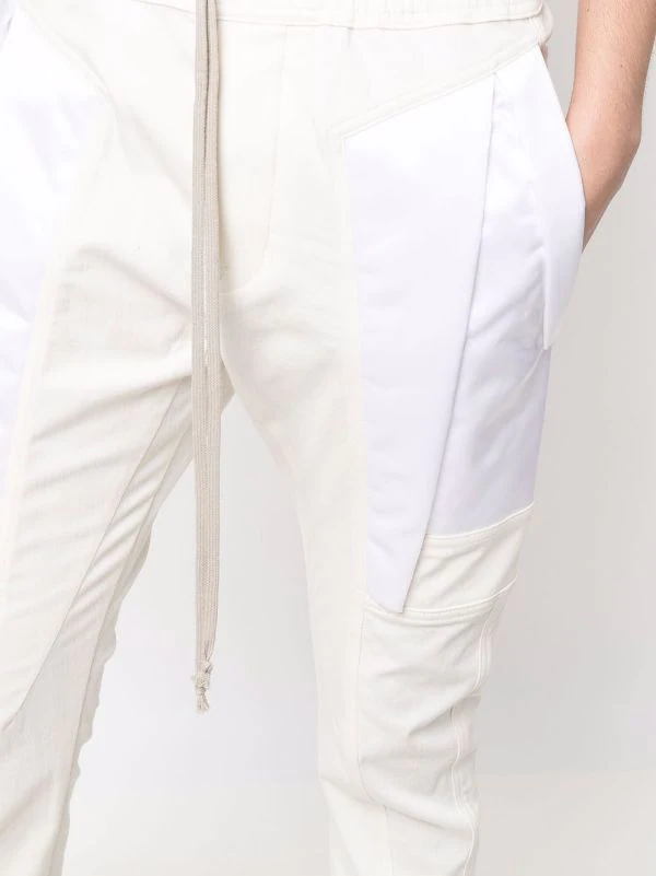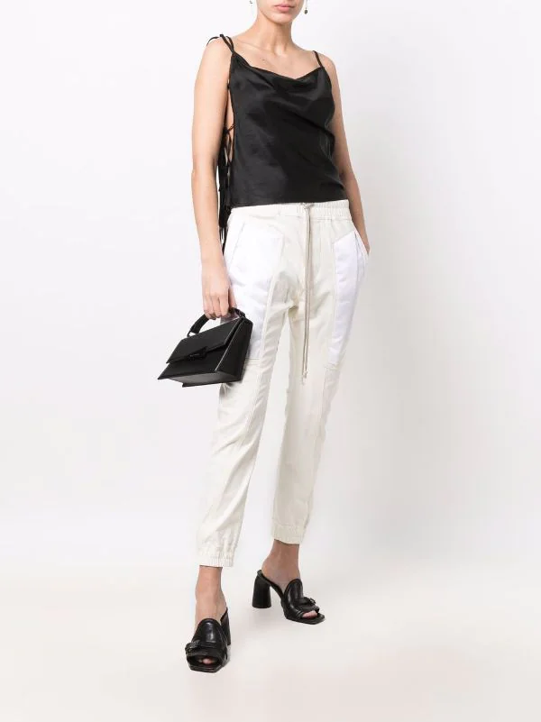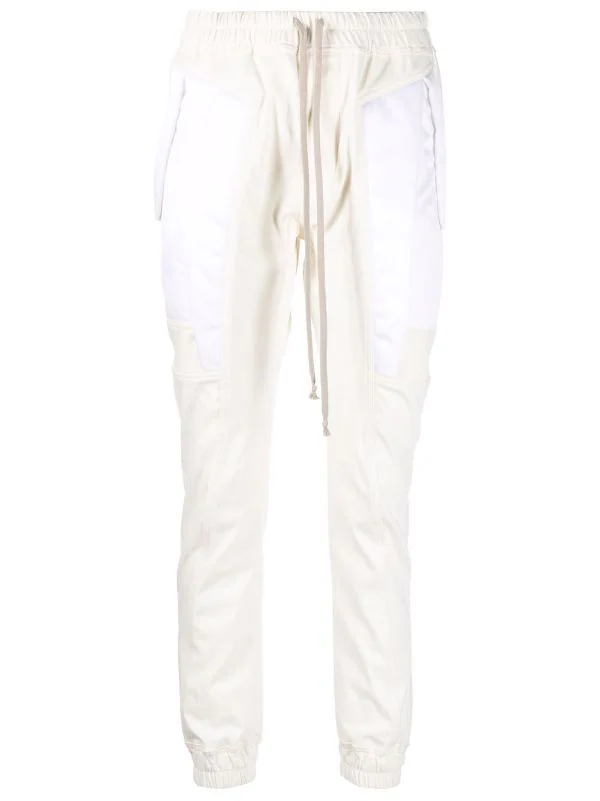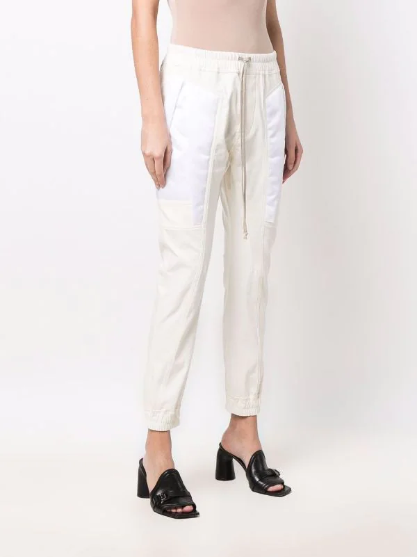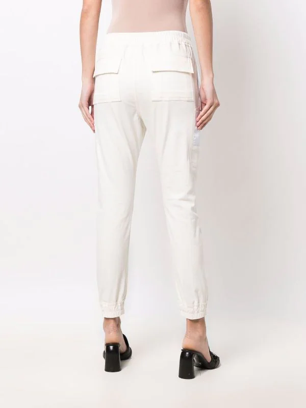Taille élastique à lien de resserrage, poches arrière à rabat, coupe fuselée, chevilles élastiques. Matière : coton mélangé.