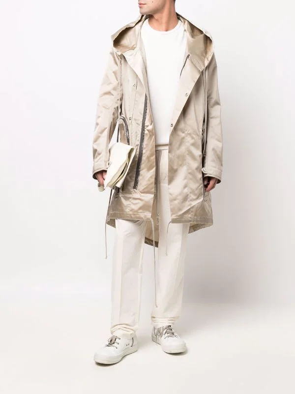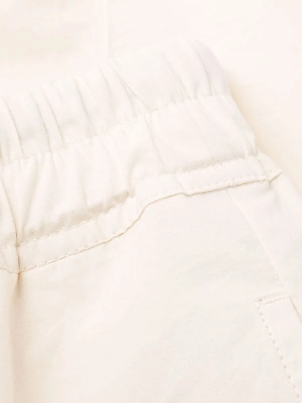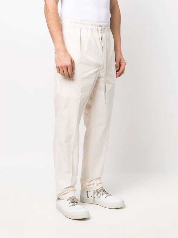 Plis marqués, lien de resserrage à la taille, coupe droite, deux poches latérales fendues, poches arrière à rabat.