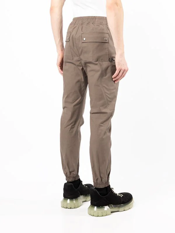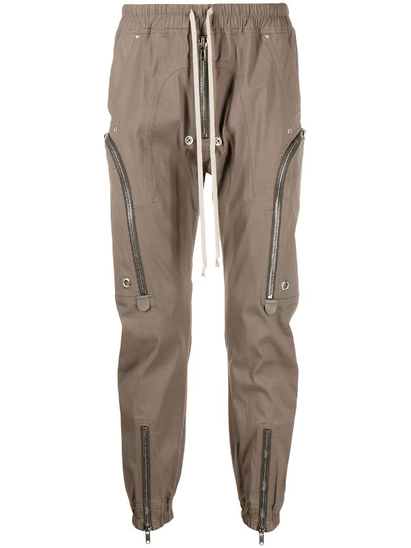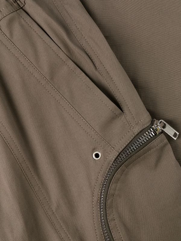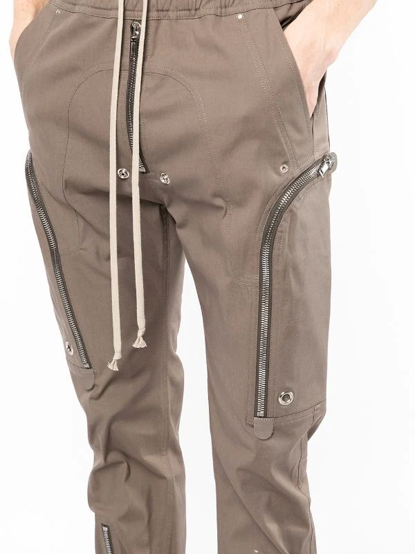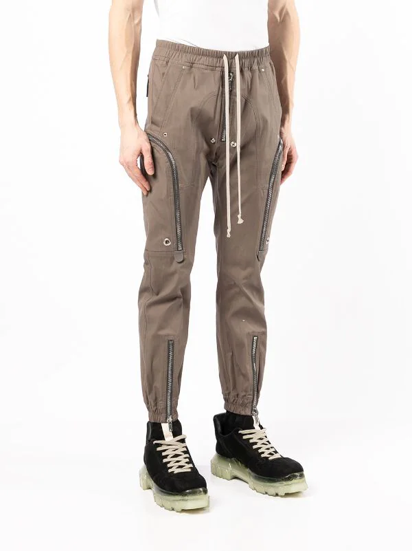 Taille à lien de resserrage, poches latérales fendues, deux poches latérales zippées, coupe fuselée, chevilles élastiques, chevilles zippées.