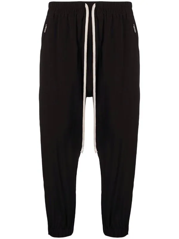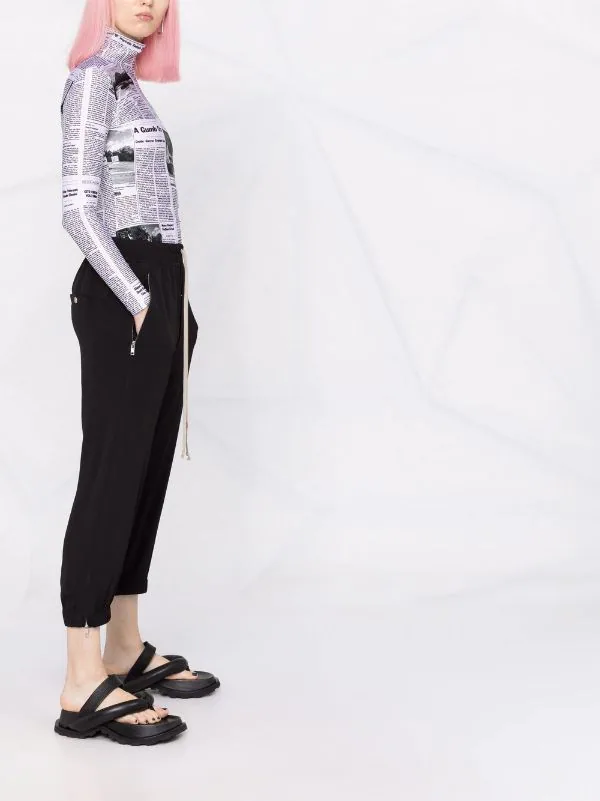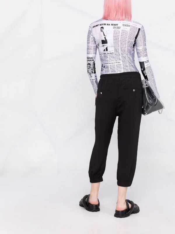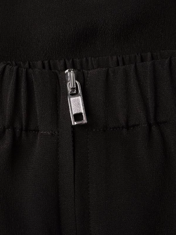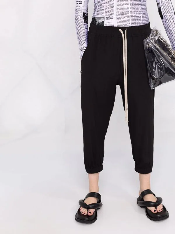 Taille élastique à lien de resserrage, entrejambe sarouel, deux poches latérales zippées, deux poches arrières boutonnées, chevilles zippées, longueur crop. Couleur : noir.