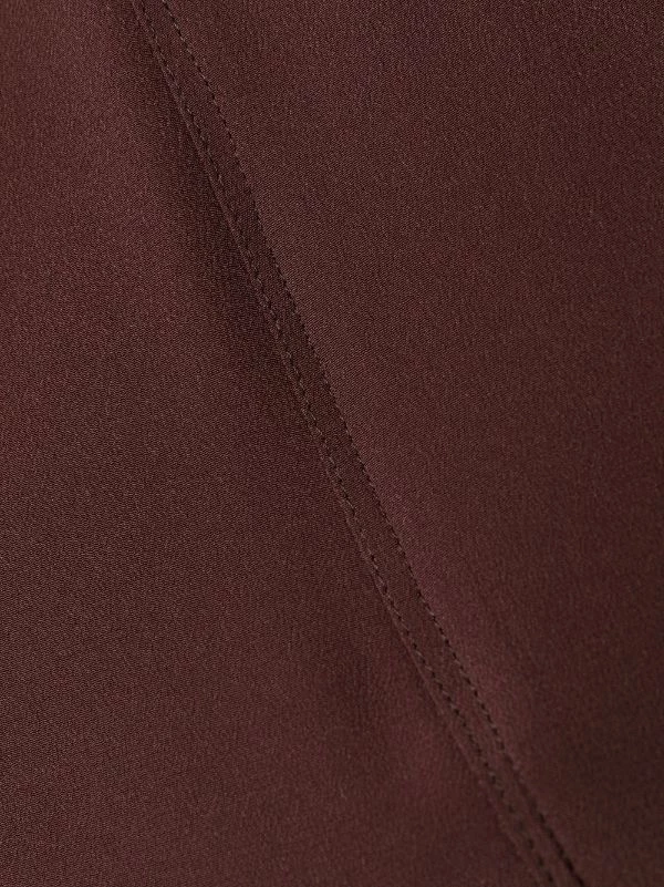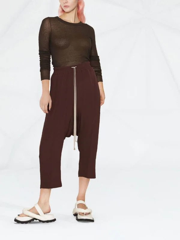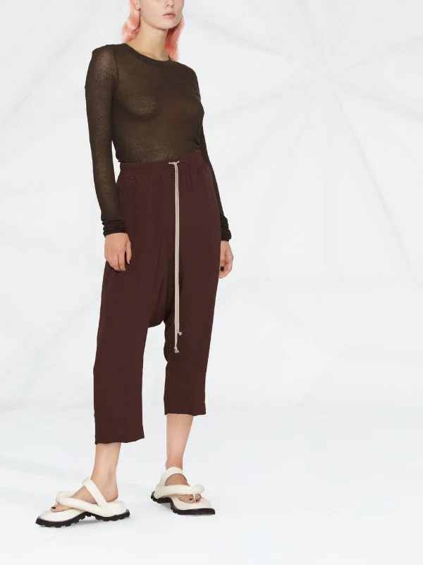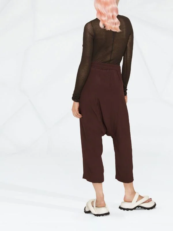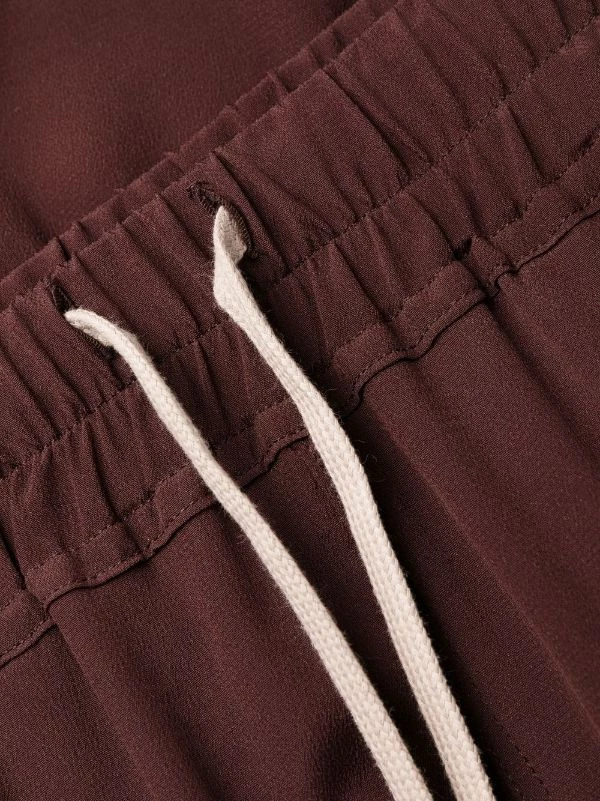 Rouge sang de bœuf, entrejambe sarouel, coupe courte, coupe fuselée, taille élastique à lien de resserrage, poches latérales fendues.