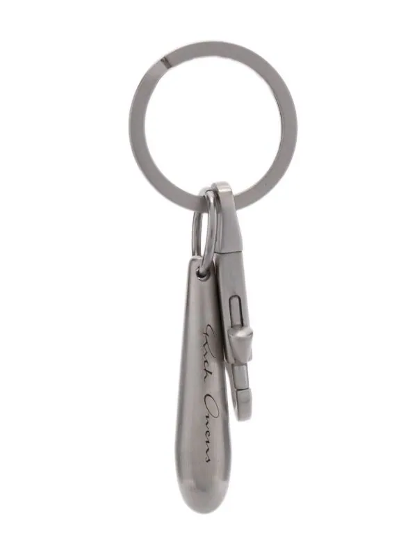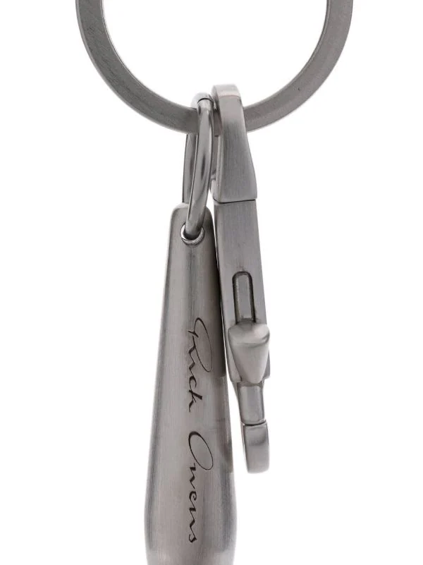 Détail de breloque, finitions en métal argenté, attache porte-clés.