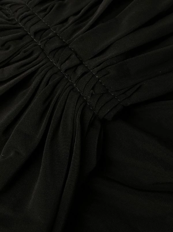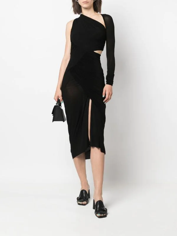 Design asymétrique, design drapé, détails de découpes, design asymétrique à une épaule, taille ajustée, coupe mi-longue. Couleur : noir.