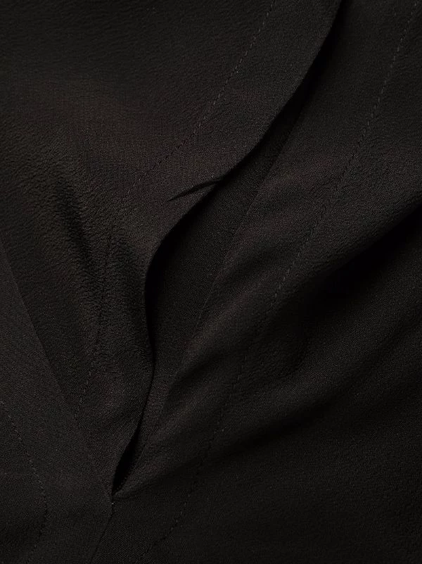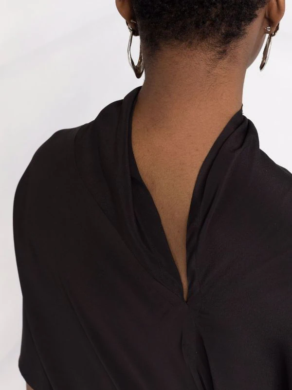 Design ton sur ton, col cheminée, manches courtes, détails de fronces. Couleur : noir. Matière : soie.