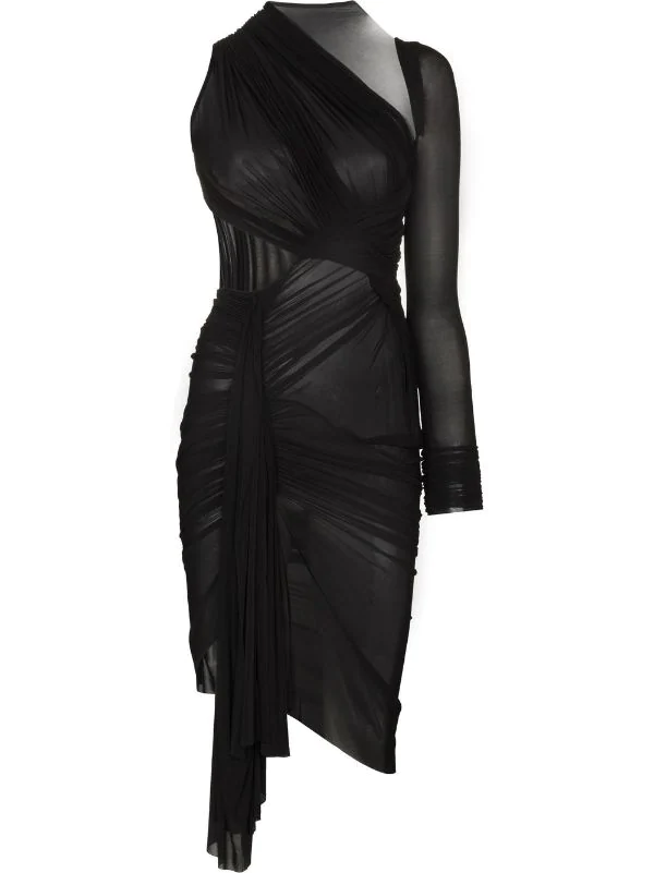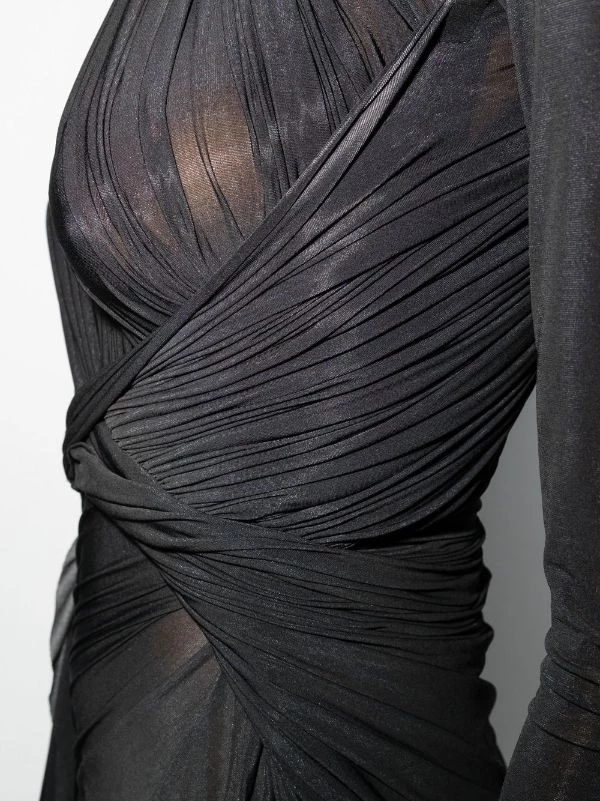 Noir de jais, détails de fronces, détails de découpes, design sans manches, coupe mi-longue.