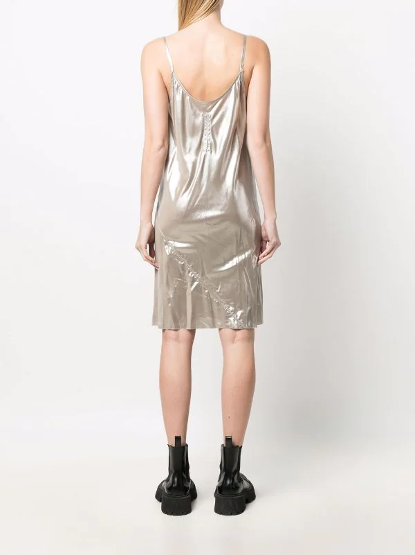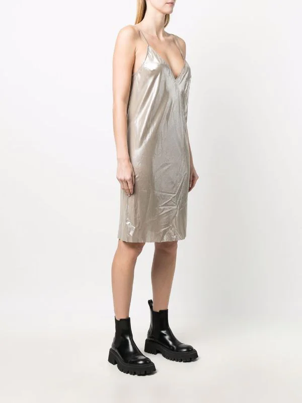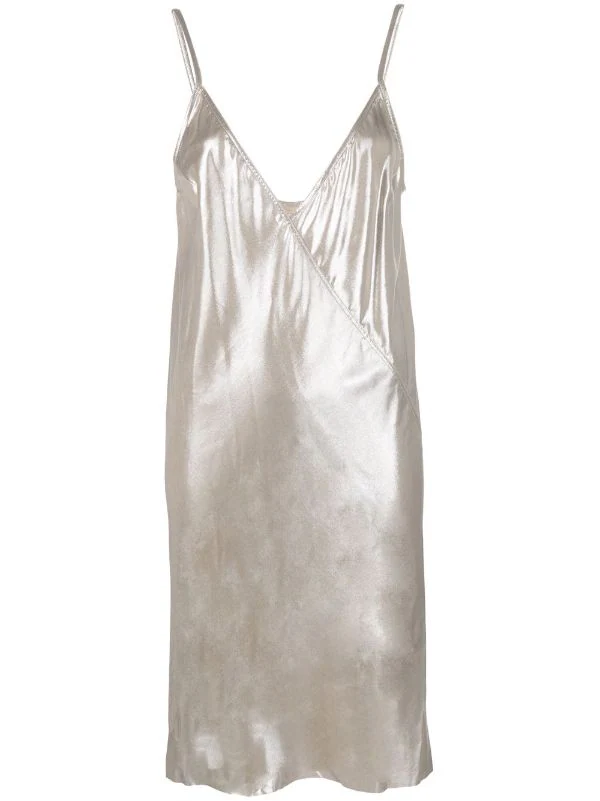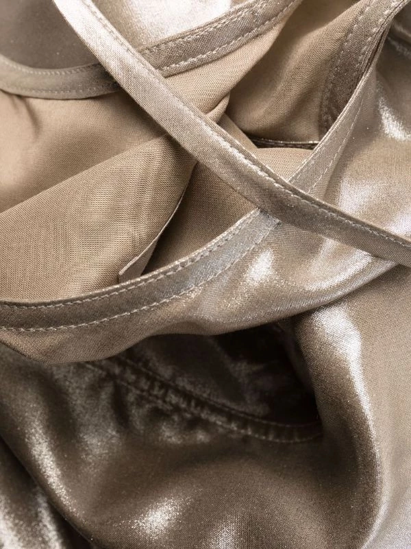 Fini brillant, col v profond, décolleté arrondi dans le dos, fines bretelles, design sans manches, ourlet droit, longueur au dessus du genou.