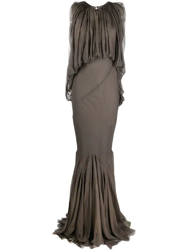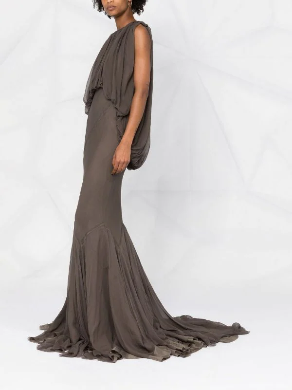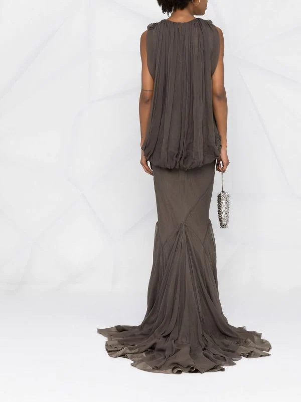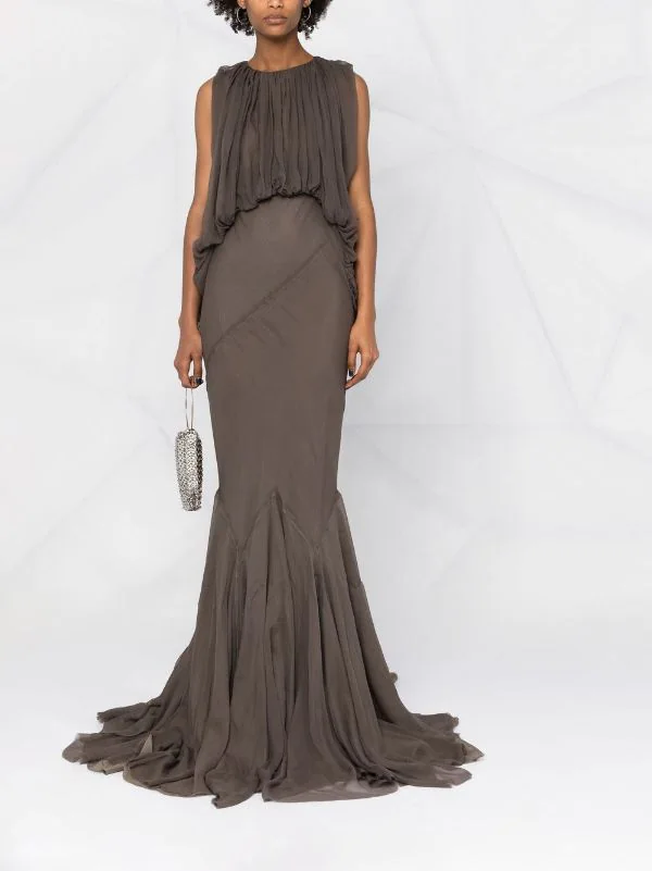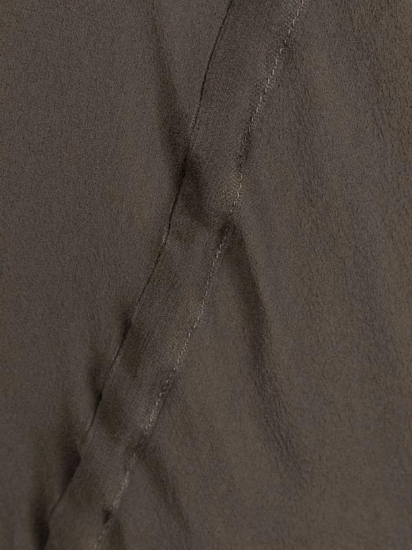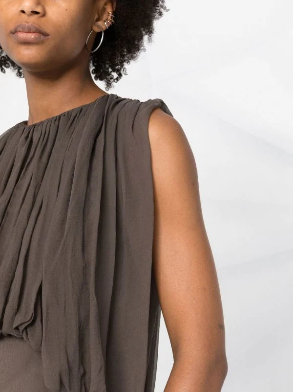 Gris, soie, encolure ronde, design sans manches, détails de fronces.