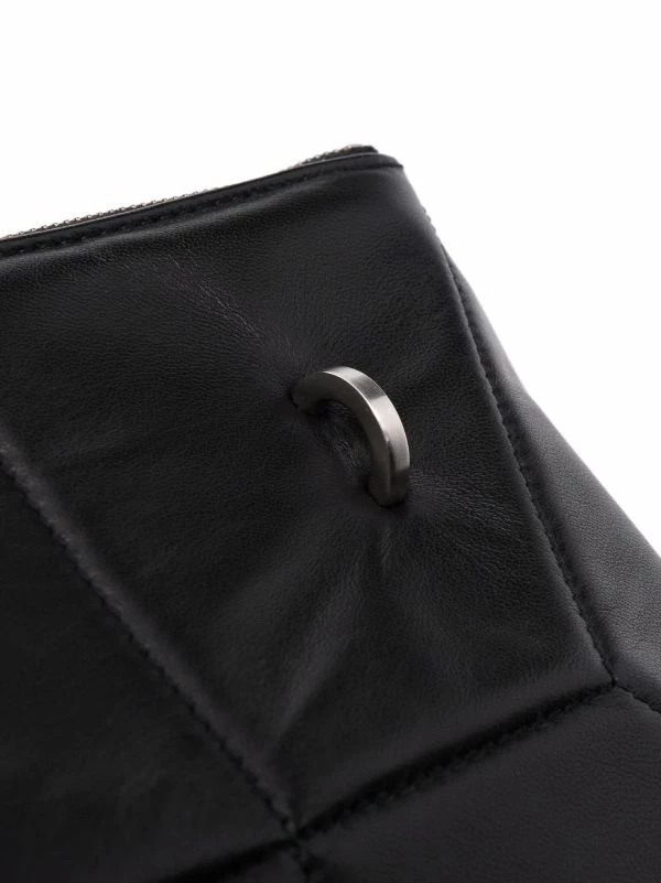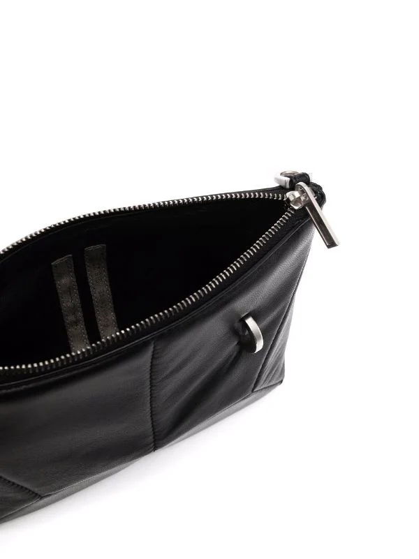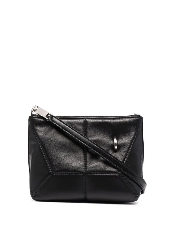 Finitions en métal argenté, design à empiècements, fermeture zippée sur le dessus, compartiment principal, bride porté épaule détachable. Couleur : noir. Matière : peau d’agneau.