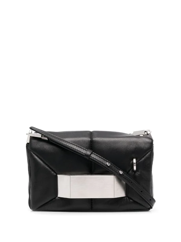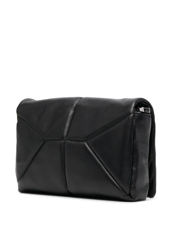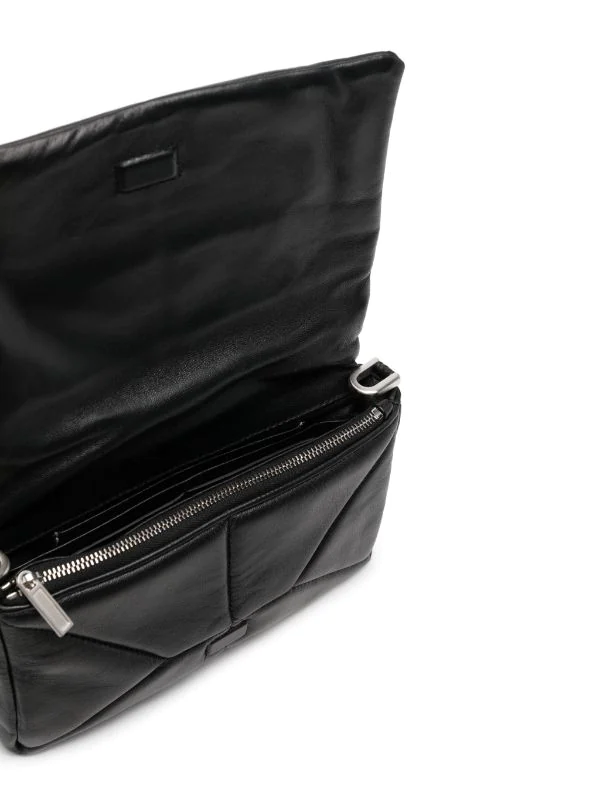 Bride porté épaule détachable, coutures ton sur ton, design matelassé, finitions en métal argenté, rabat sur le dessus à fermeture magnétique, compartiment zippé, compartiment principal, compartiments intérieurs pour carte. Couleur : noir. Matière : cuir.