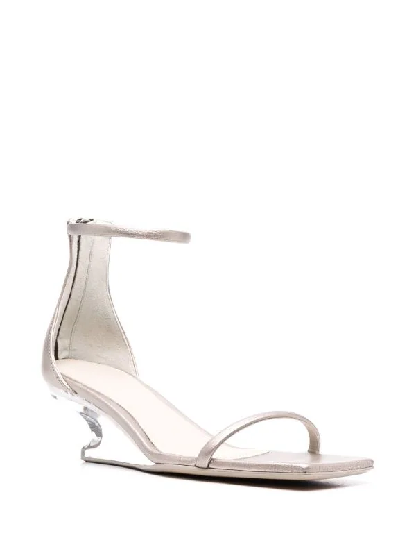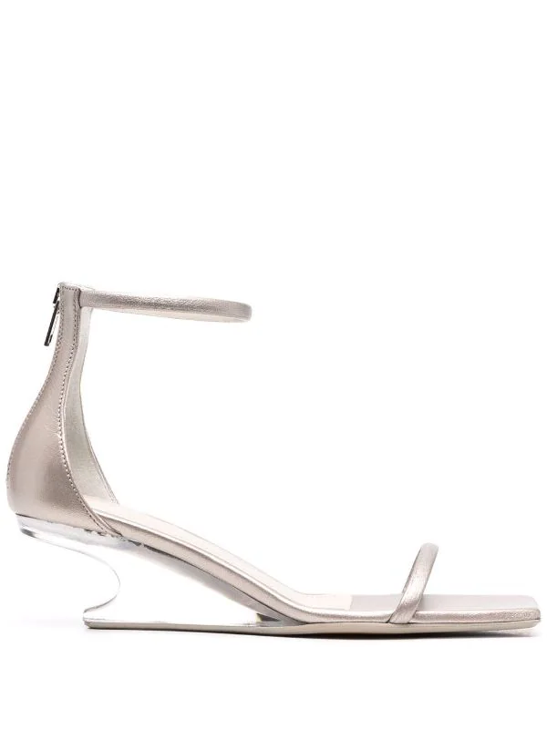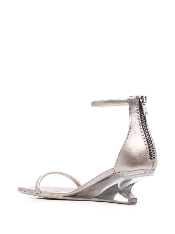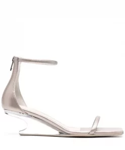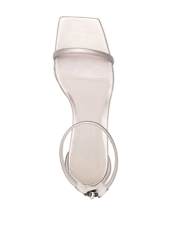 Fermeture zippée à l’arrière, fini métallisé, petit talon sculpté, bride cheville. Couleur : argent. Matière : cuir.