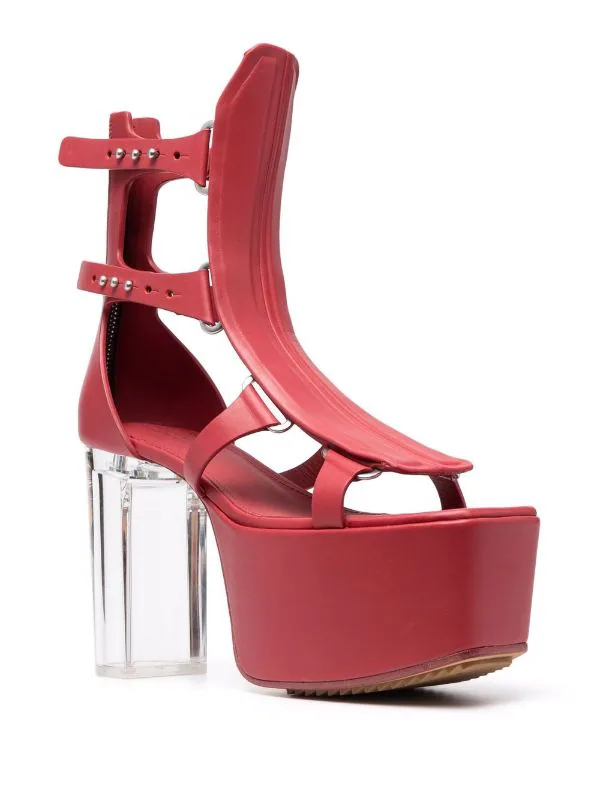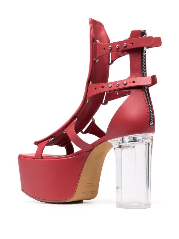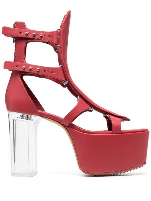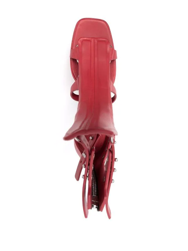 Bout ouvert, fermeture zippée à l’arrière, semelle à plateforme, talon haut. Couleur : rouge. Matière : cuir.