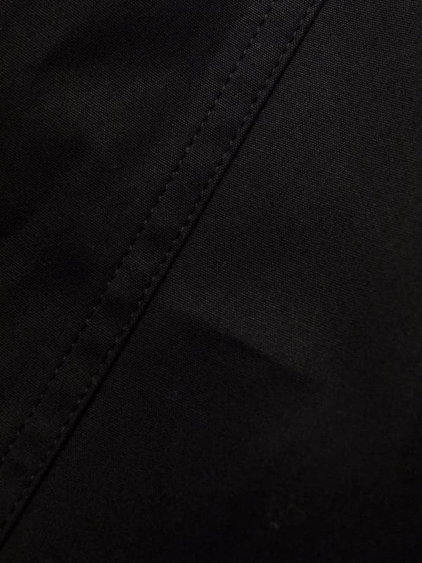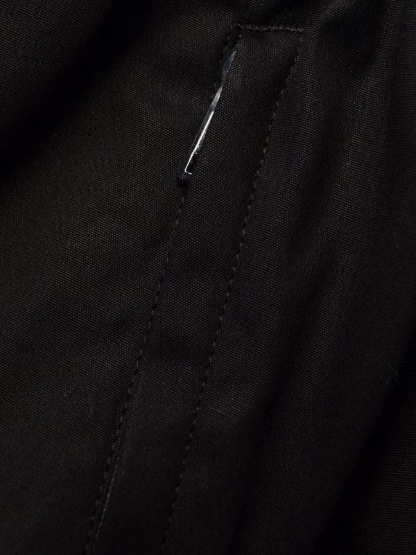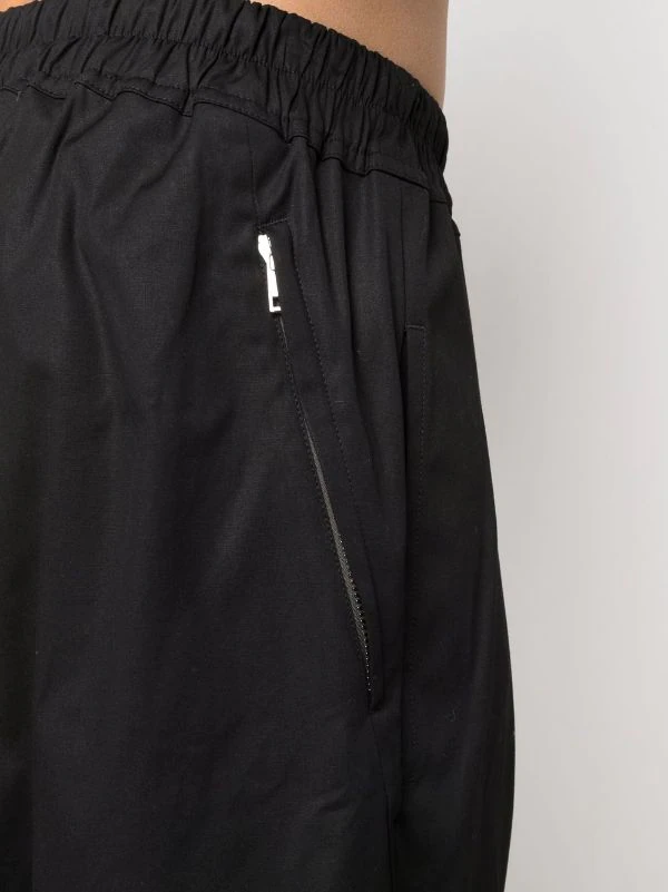 Fentes latérales, taille élastique à lien de resserrage, poches latérales fendues, deux poches arrière zippées. Couleur : noir.