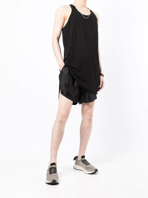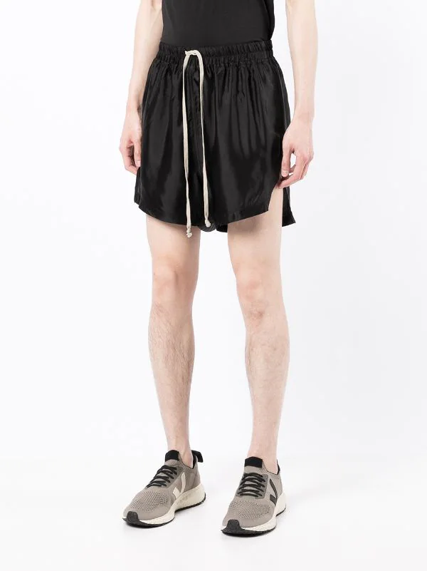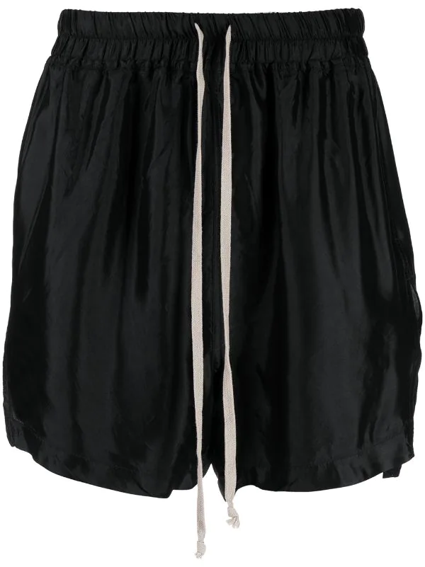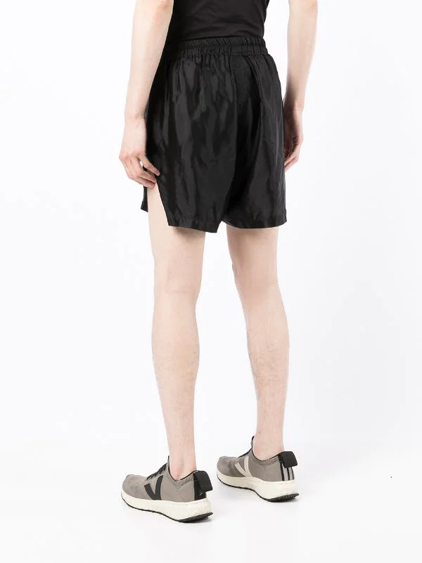 Taille élastique à lien de resserrage, fentes latérales, poches latérales fendues, hauteur cuisse. Couleur : noir.