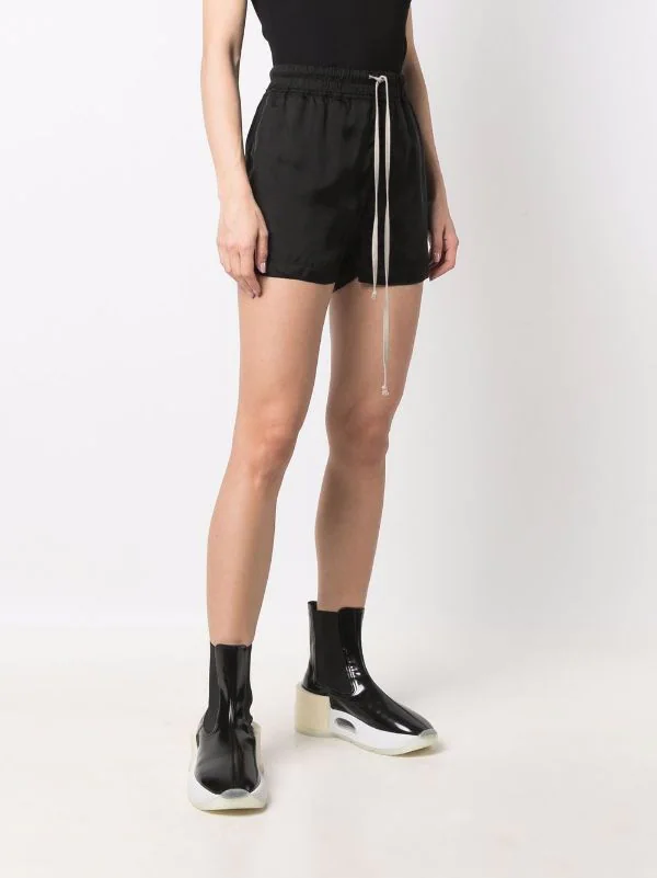 Taille haute, taille élastique à lien de resserrage, poches plaquées latérales, coupe courte. Couleur : noir.