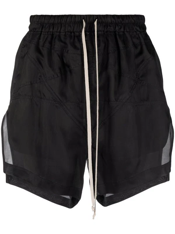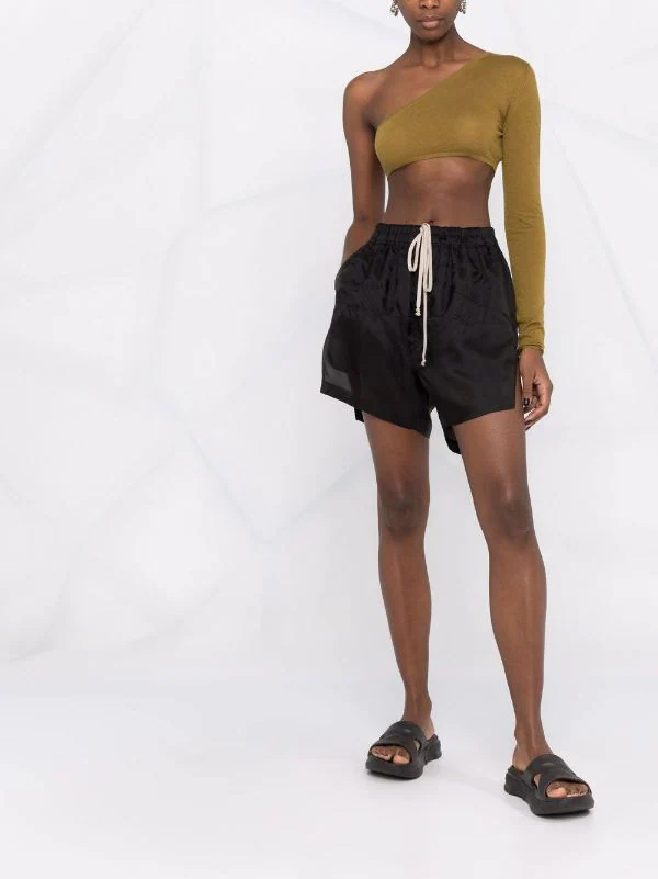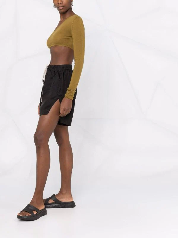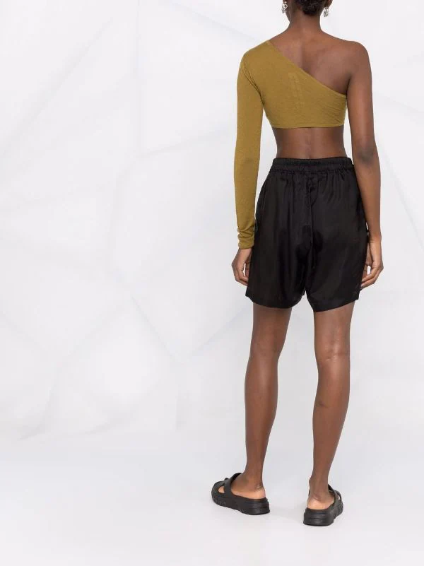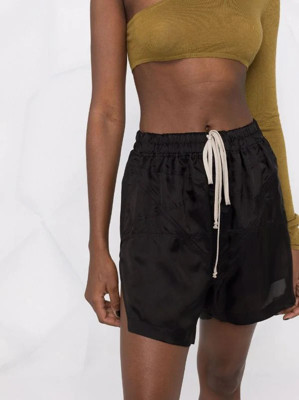 Coutures ton sur ton, détails de coutures apparentes, fentes latérales, poches latérales fendues, taille élastique à lien de resserrage. Couleur : noir.