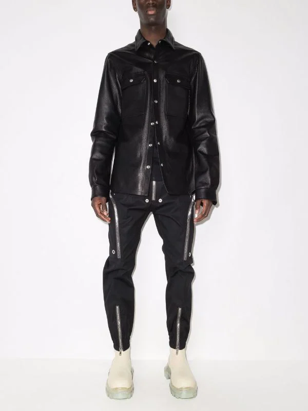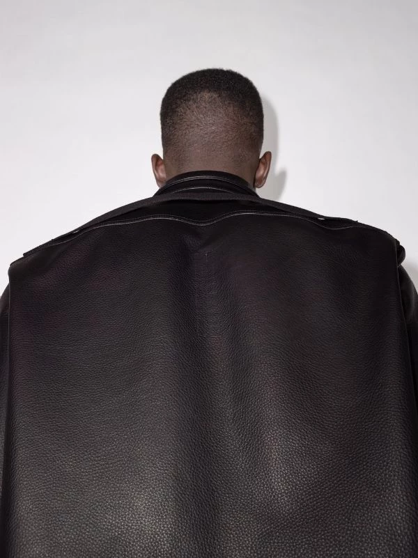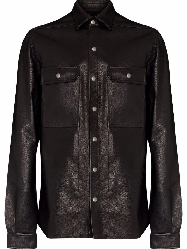 Col italien, fermeture à boutons pression sur le devant, manches longues, poignets à boutons pression, deux poches poitrine à rabat, ourlet incurvé. Couleur : noir. Matière : cuir de veau.