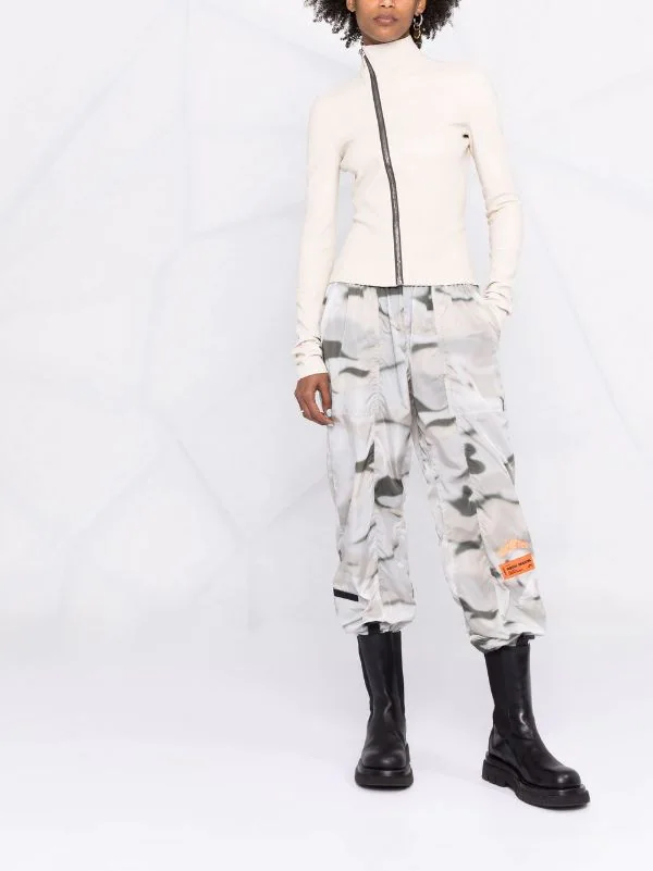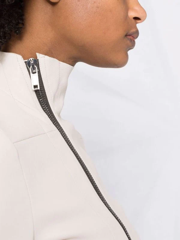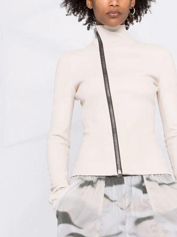 Design asymétrique, fermeture zippée en biais, manches longues, construction stretch. Matière : peau d’agneau.