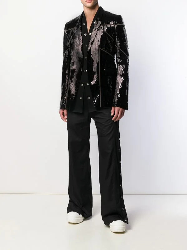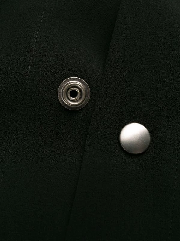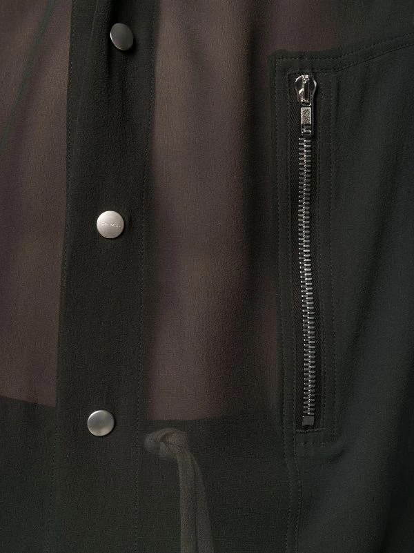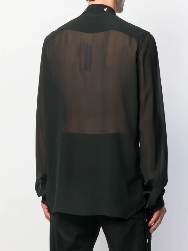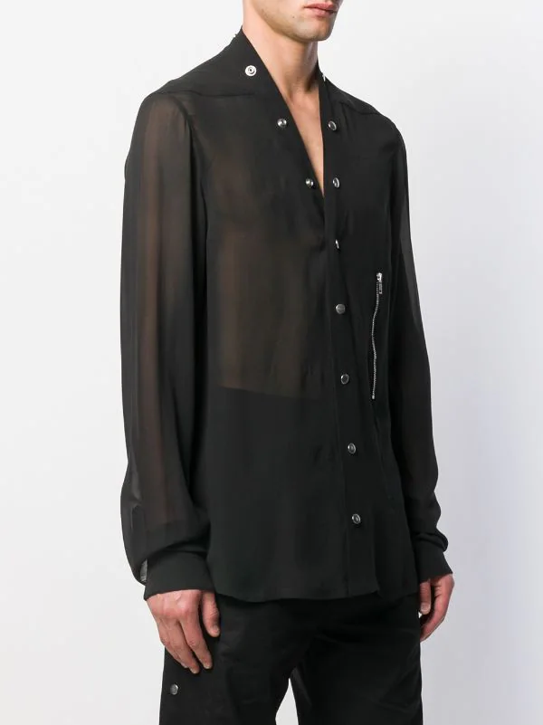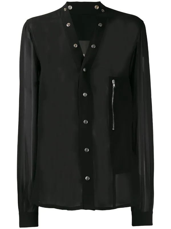 Chemise transparente à boutons pression Rick Owens avec fermeture à boutons pression, manches longues, poche zippée devant, coupe ample et ourlet droit. Couleur : noir.