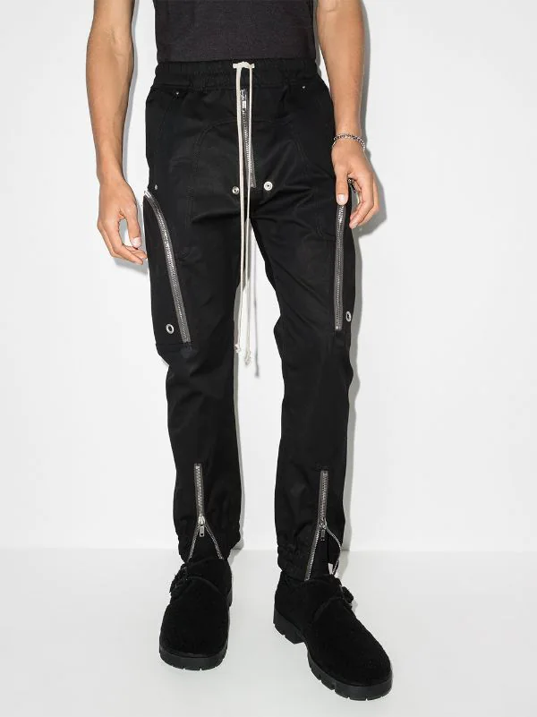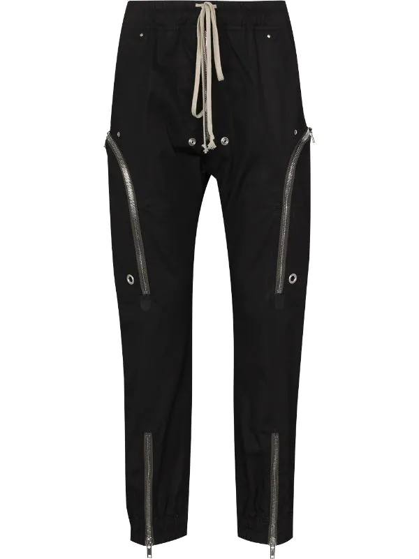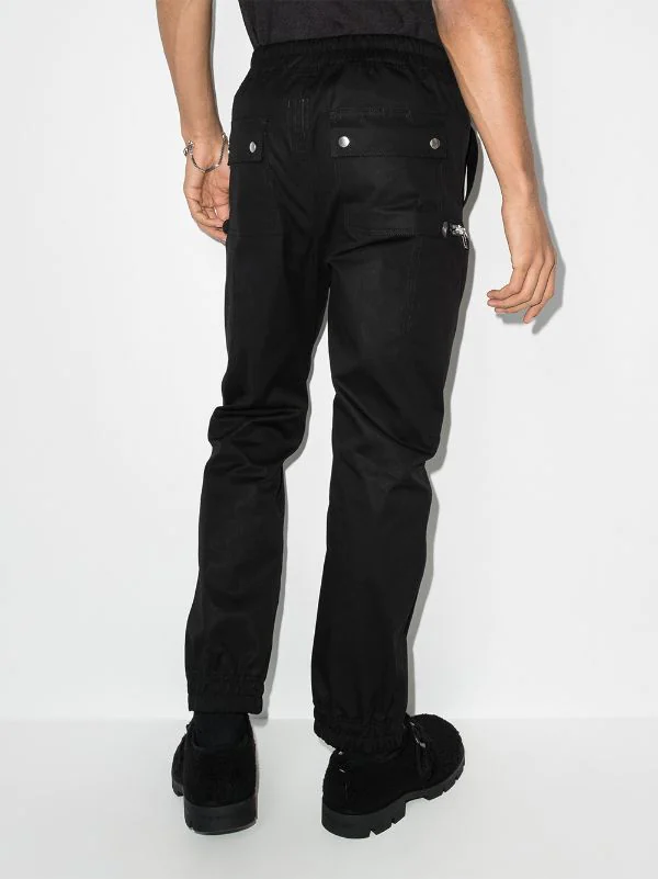 Taille à lien de resserrage, poches latérales fendues, deux poches latérales zippées, coupe fuselée, chevilles élastiques, chevilles zippées. Couleur : noir.