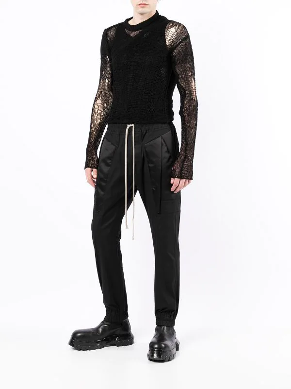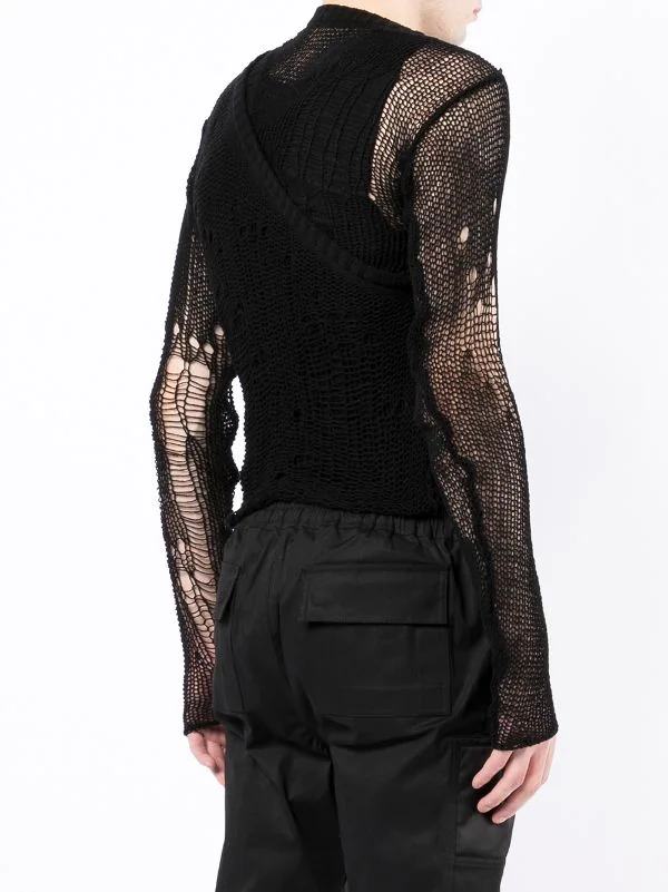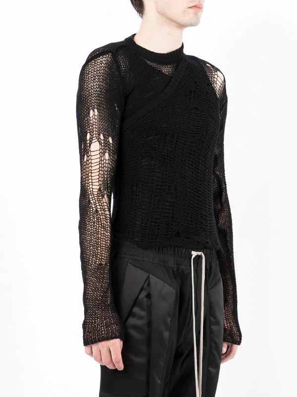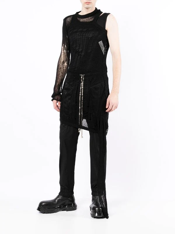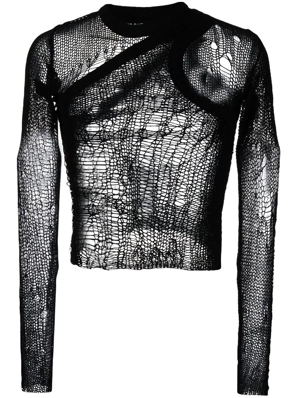 Maille ajourée, effet de transparence, design asymétrique à une épaule, encolure ronde, effet usé, manches extra-longues, ourlet droit. Couleur : noir.