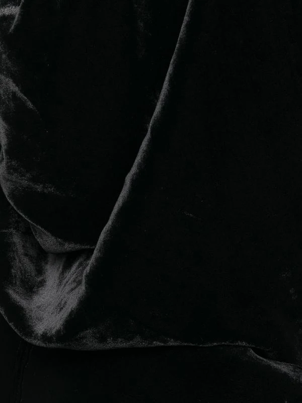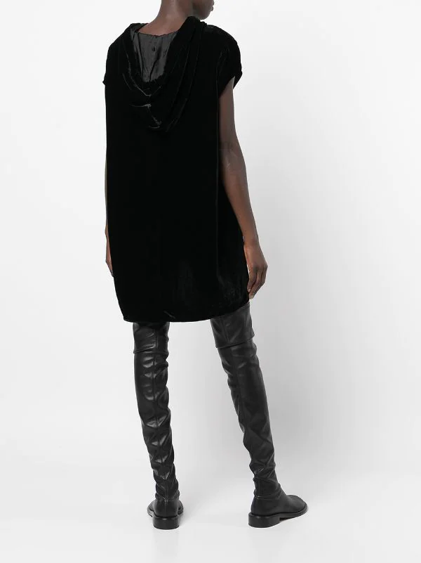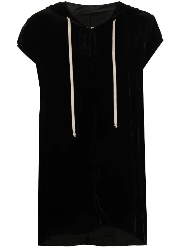 Effet velours, capuche à lien de resserrage, coupe évasée, manches courtes, longueur au dessus du genou. Couleur : noir.