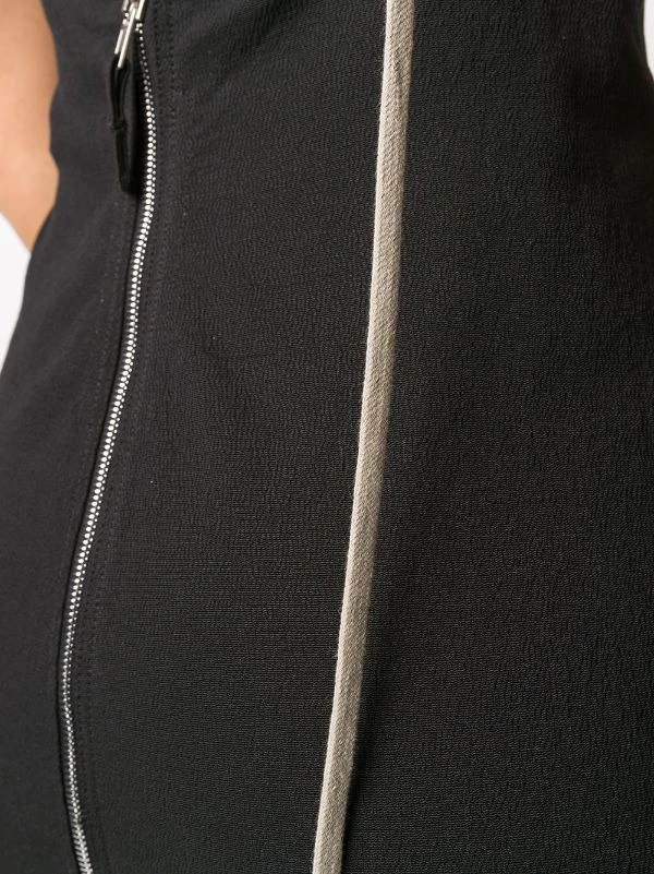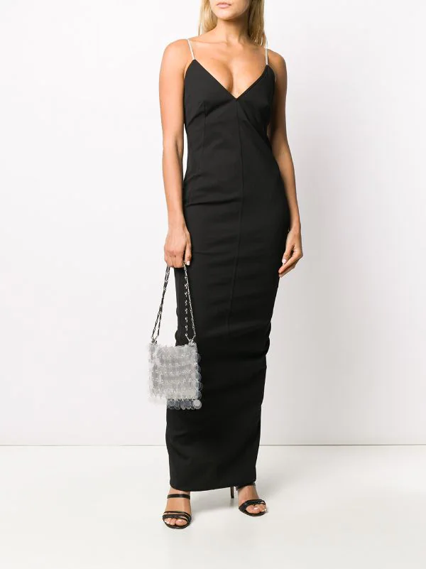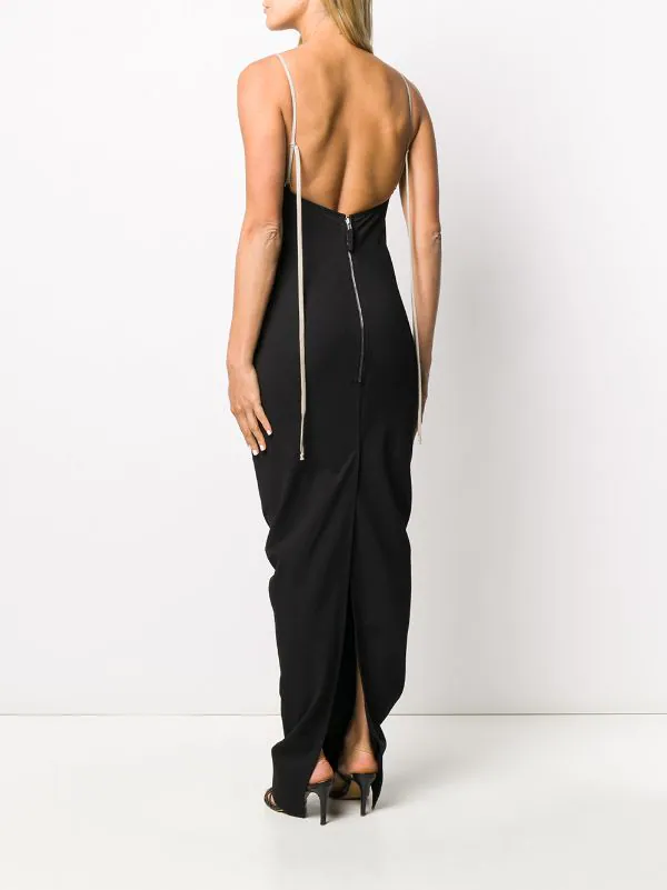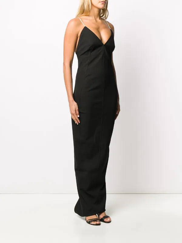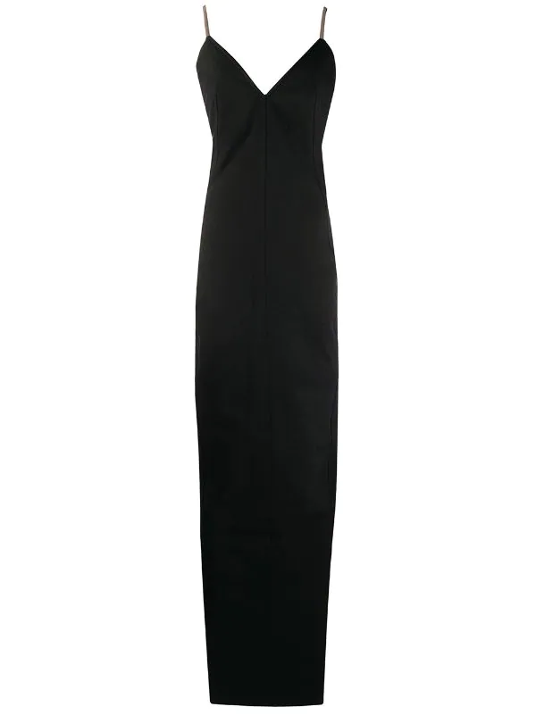 Robe ajustée à dos nu en coton mélangé Rick Owens avec col v profond, bretelles réglables, forme crayon, fente arrière, fermeture zippée arrière et coupe longue. Couleur : noir.