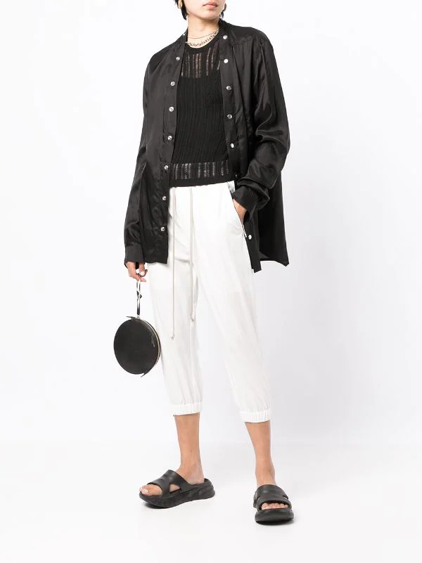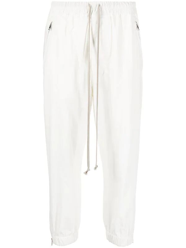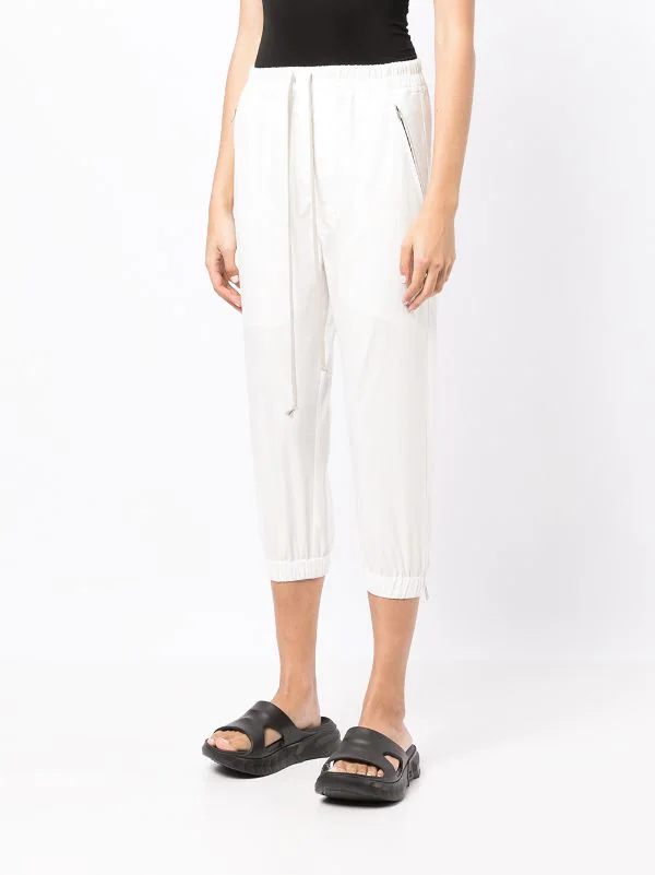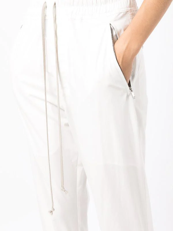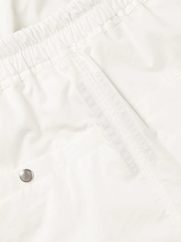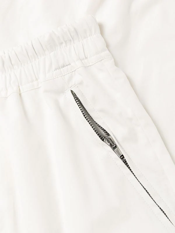 Taille haute, lien de resserrage à la taille, deux poches latérales zippées, coupe fuselée, coupe courte. Couleur : blanc. Matière : coton.